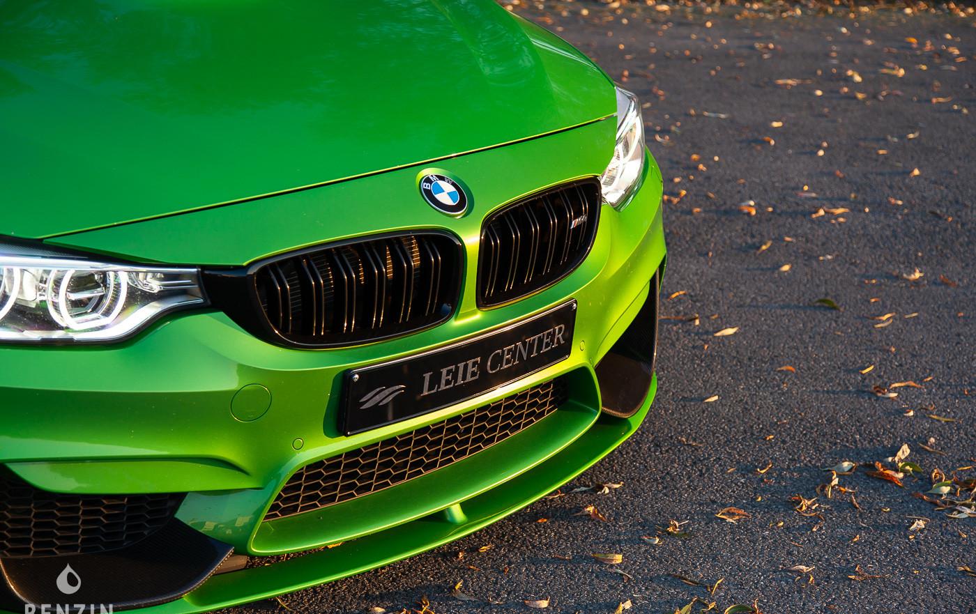 Cette M4 a reçu à l’extérieur une teinte unique “Java Green”. La peinture est en excellent état, ne montrant aucun défaut. La voiture est équipée de nombreux accessoires M Performance installés spécifiquement pour le pilote comme notamment l’aileron, les rétroviseurs, les sorties d’échappement et le diffuseur en fibres de carbone.