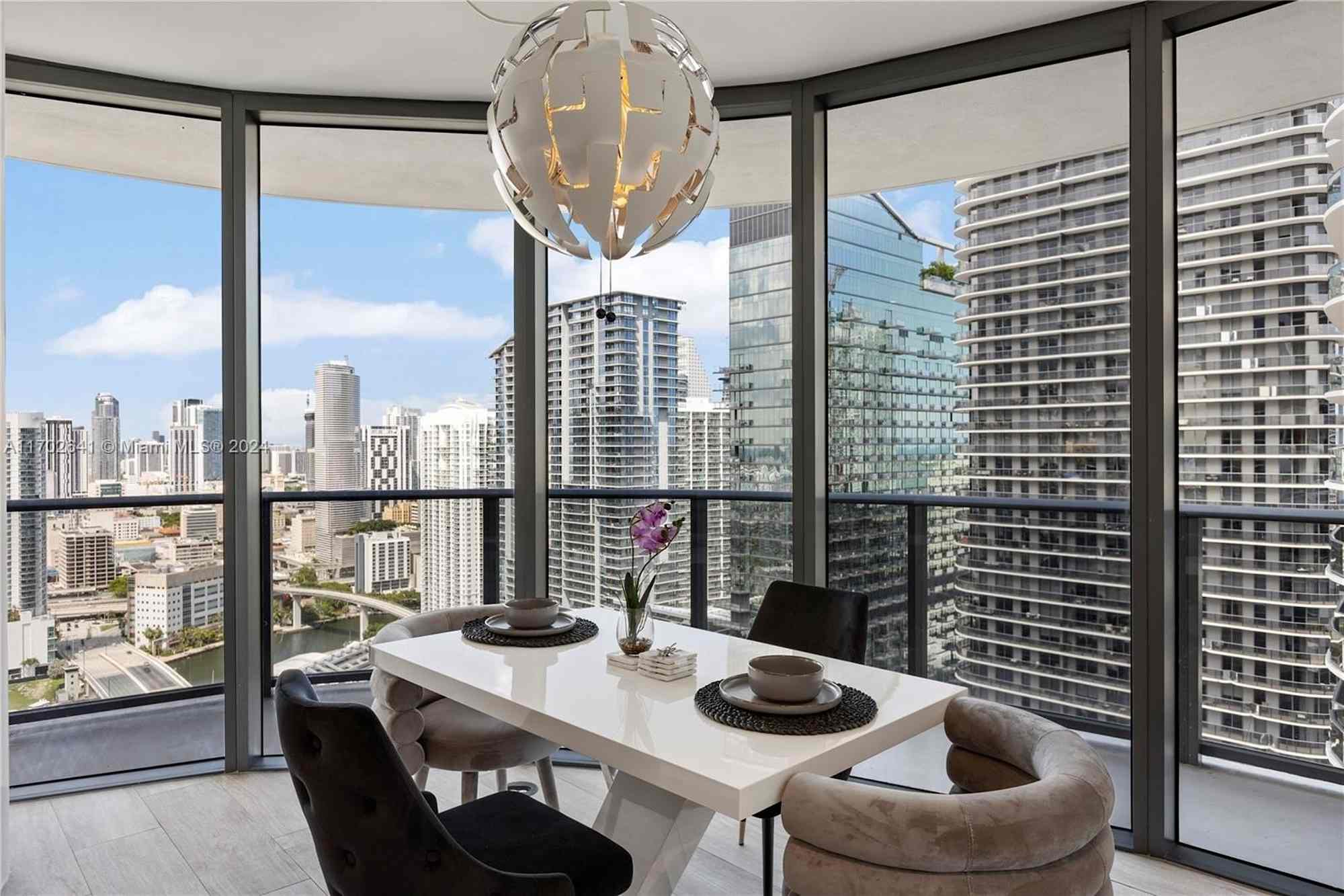 Elegant 2 Bedroom 2 Bathroom +Den corner unit with designer furnishings and stunning views of the Miami River & Brickell City Center. Italkraft kitchen, premium porcelain flooring, contemporary light fixtures, floor-to-ceiling windows, a wraparound balcony offering stunning skyline and river views. Residents enjoy world-class amenities, including a sky pool deck, lap pool, fitness center, spa, sauna, steam room, entertainment rooms, business center, kids' playroom, movie theater, 24/7 concierge service. Steps from Brickell City Centre, fine dining, upscale shopping. This property is ideally located for work & play