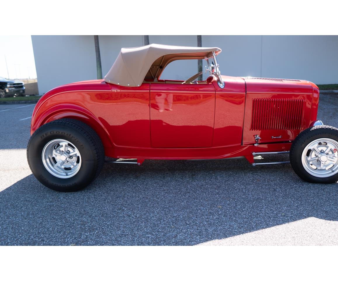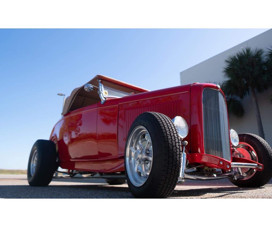 The engine sports a Holly 670 CFM carburetor, Eldebrock intake, performance harmonic dampener, Chrome mechanical fuel pump, and even headers. This car is a true head turner and show winner. The body is made by Kilbourne and painted in a beautiful Viper Red with Tan pin stripping.