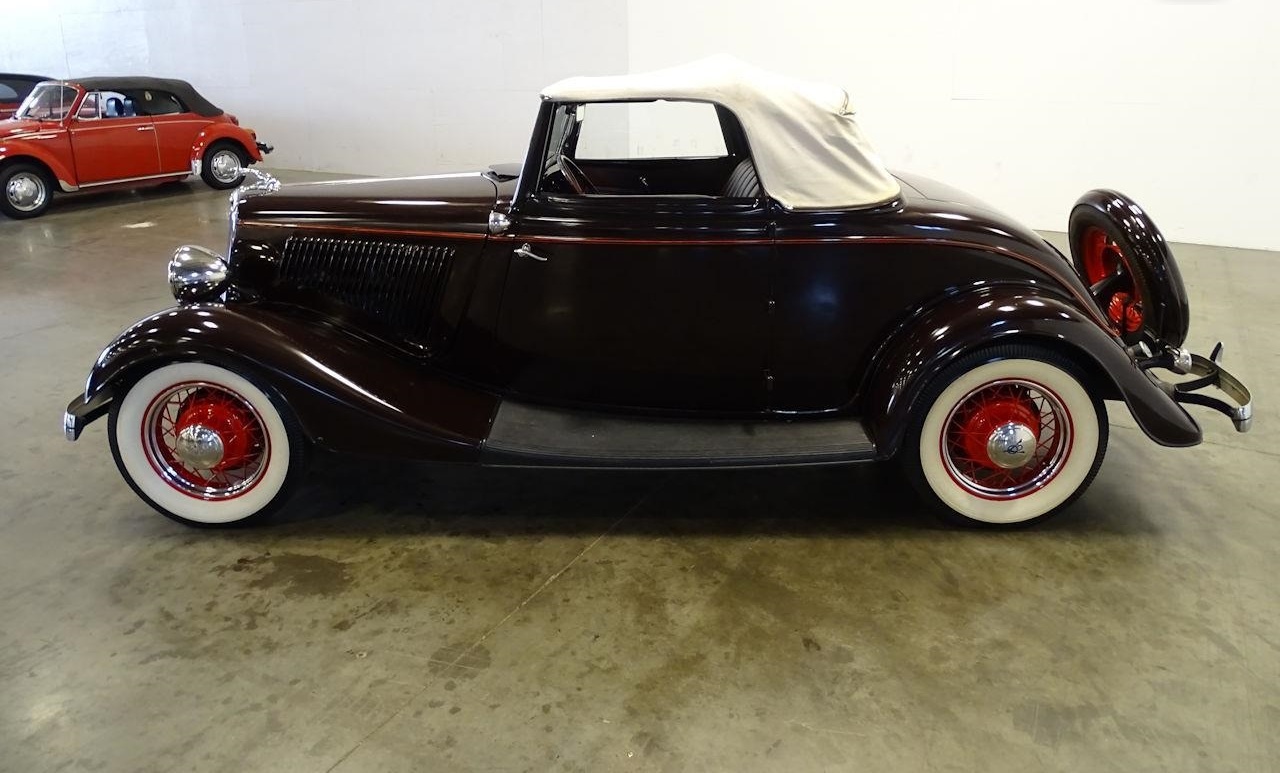 This 1934 Ford Cabriolet Convertible for sale is a timeless piece of art. Powering this mighty machine is a stout 221CID V8 that has rumble of a big block but the fuel sipping quality of a small flathead V8. Backing this powerplant is a 3-speed manual transmission. The interior of this magnificent 1934 Ford Cabriolet Convertible for sale is a soft and plush vinyl brown that meshes perfectly with the exterior color. Options on this 1934 Ford Cabriolet Convertible for sale include: Wire wheels that are wrapped in whitewall bias ply tire, comfortable bench seating, manual convertible top.