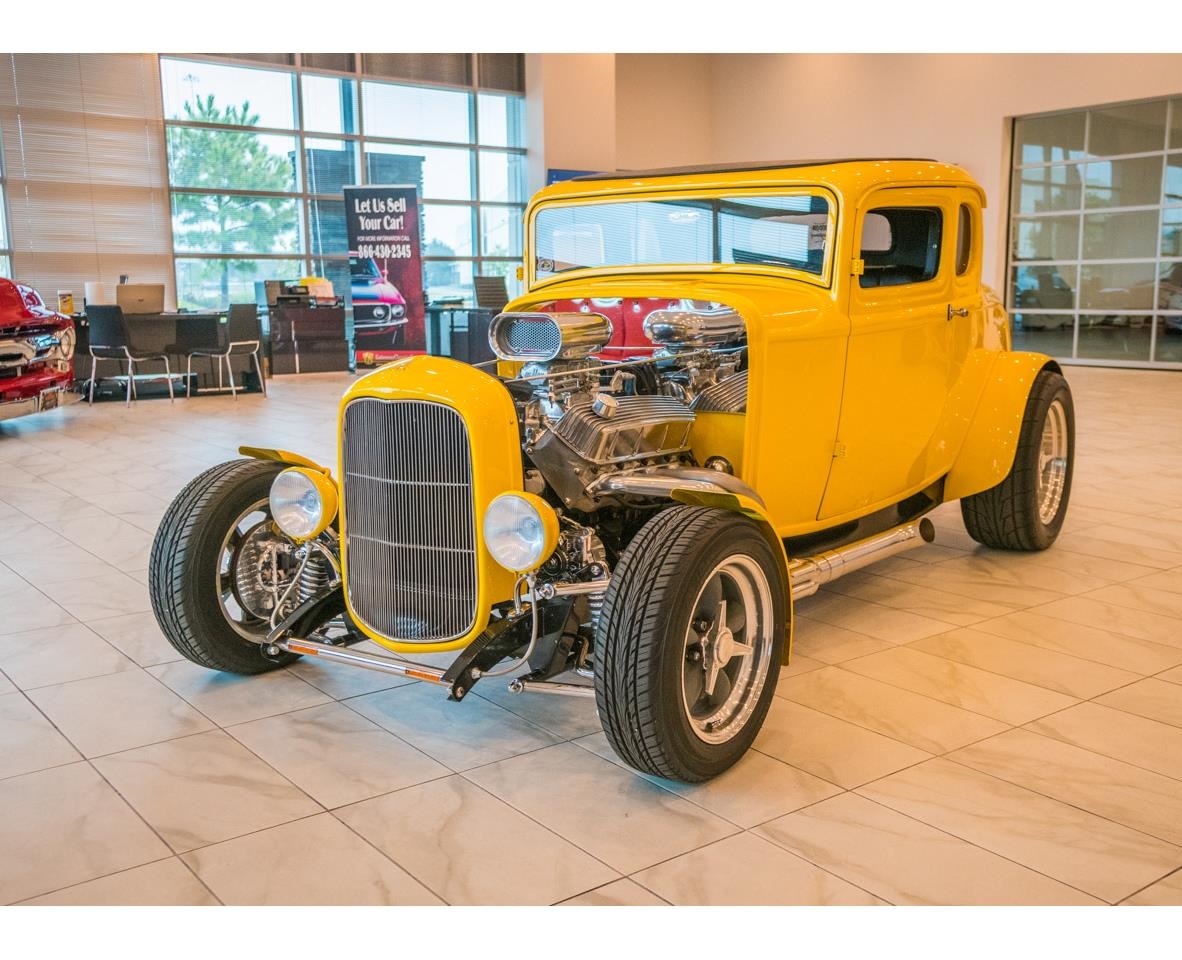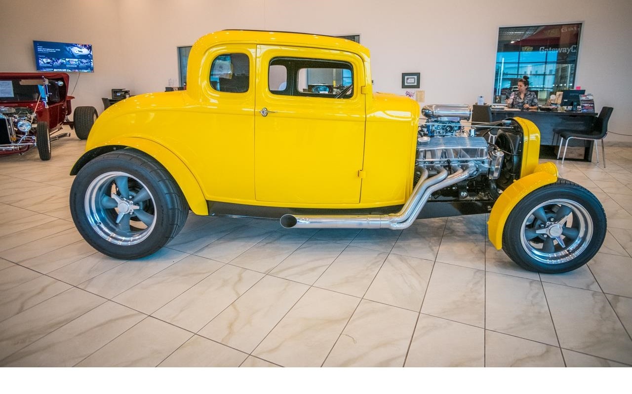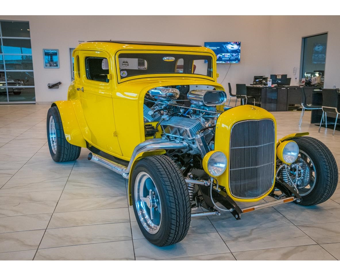 1932 Ford 5-Window Coupe. Driven by a fresh 502 CID V8 crate, power is plenty and readily available when you want to have some fun. Shift your way through the powerband with the Richmond 5-speed transmission. Controlling all the power as it gets to the ground is a Posi-trac Curri 9" rear end with 3:90 gearing. With a Heidts front end, Adjustable coil over shocks in rear, tubular upper and lower control arms, and custom tubed chassis this hotrod handles very well. Front disc brakes and drums out back provide enough to come to a solid stop in a timely manner. The exterior of this car makes it very hard to miss. A vibrant yellow paint demands attention and certainly gets it. The top has been chopped slightly but still has plenty of room for most to fit inside. The interior is nicely done in a black vinyl because everyone knows black and yellow go well with each other. Tucked alongside the passenger seat you will find a Bluetooth stereo set up which even allows phone calls for hands free driving.