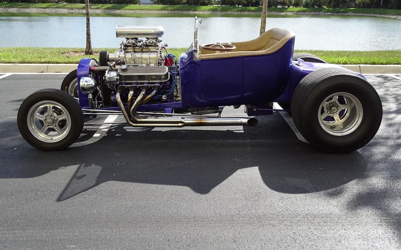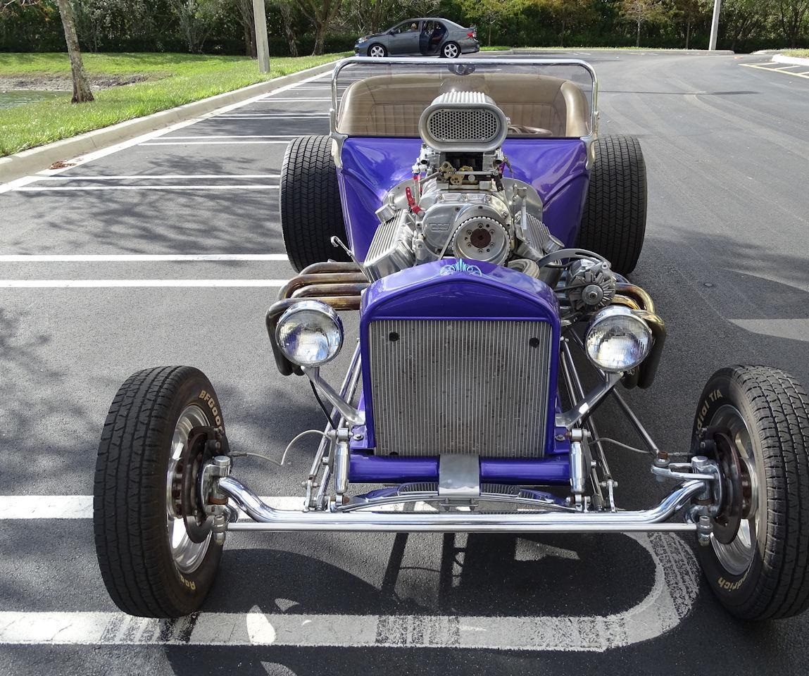 The engine is basically a stock 454ci V8 Chevy big block with a polished Weiand 6:71 blower with twin 650 CFM Holly carbs. 8.5 to 1 compression ratio and a 12% underdrive on the blower provides dependable drivability. A 4-row aluminum radiator keeps things cool.