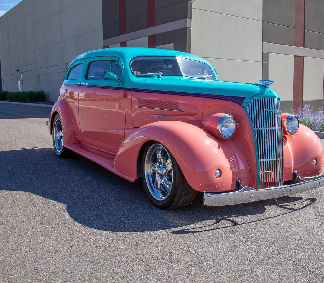 This one has a lot of the creature comfort amenities such as: 350 Chevy engine, mated to a 3 speed transmission putting power to a 10 bolt rear end sporting 3.55 gear ratio. Camaro Front Clip. 18" Intro Wheels in front, 20" Intro Wheels in the rear.