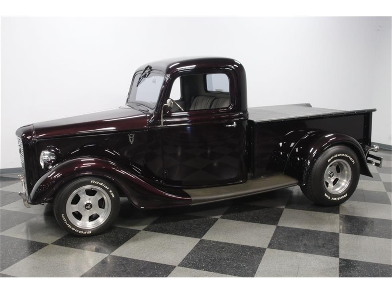1936 Ford Pickup custom streetrod - 350 cubic-inch V8 power done with plenty of added shine. This motor has been enhanced with a Weber four-barrel carburetor, Edelbrock Performer RPM intake, and shorty headers feeding the dual exhaust. As you look underneath the truck, you're going to find terrific upgrades, like a Mustang II-style independent front end with tubular A-arms, a strong ladder bar setup out back, a custom crossmember, and a Ford 8-inch rear end. Plus, you have front disc brakes and rack & pinion power steering. If this sounds like a great classic to drive near or far, then you'll also love the four-speed automatic transmission w/highway-friendly overdrive. The operation of the doors has the kind of quality feel that tells you this is a well-done build, and when you look inside, there are all the right signs of a solid investment. The two-tone gray tweed is well-coordinated on the seats, door panels, and carpeting. There are modern upgrades like R134a air condition and an AM/FM/CD stereo with USB input for your phone. There are even provisions for nice features like power windows and a radar detector.