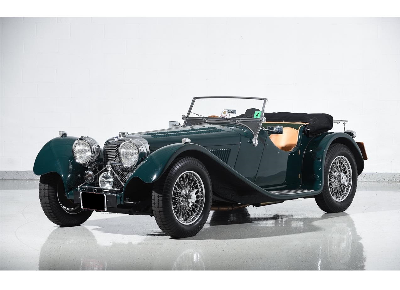 1937 Jaguar SS in classic British Racing Green on its fiberglass body panels with Tan leather trimming the cockpit. The engine-turned instrument panel and classic instruments lend a vintage feel to the cockpit. The car is fitted with a vintage 1965 Jaguar 4.2L DOHC XK engine mated to a compact short throw Jaguar 4-Speed box with overdrive on top gear. This lightweight car has the power and torque of an E-Type with lighter weight for truly impressive performance. Moto-Lita wood steering wheel, Lucas QK596 headlamps, and a single driving light. The car has full weather gear including a Black top and side curtains.