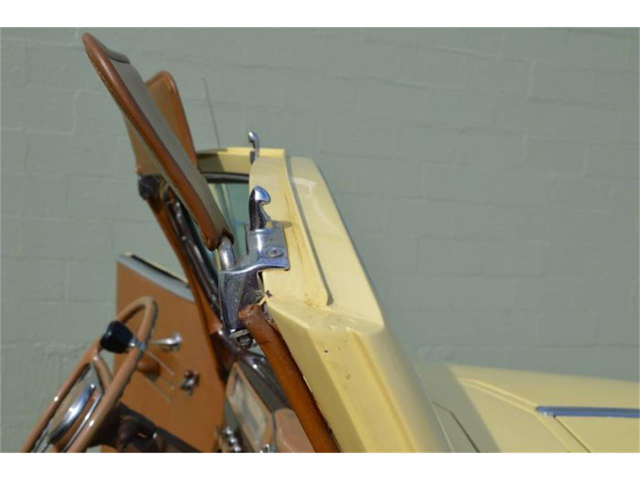 1941 Packard 110 convertible powered by a straight 6 engine with a manual 3-speed transmission. This car is equipped with brown leather seating, Cadet Cream exterior paint, radio and clock, wipers, turn signals, fog lamps, full hubcaps, cloth top, wide white wall tires, Goddess of Speed hood ornament, full spare, floor mats, Tonneau cover.