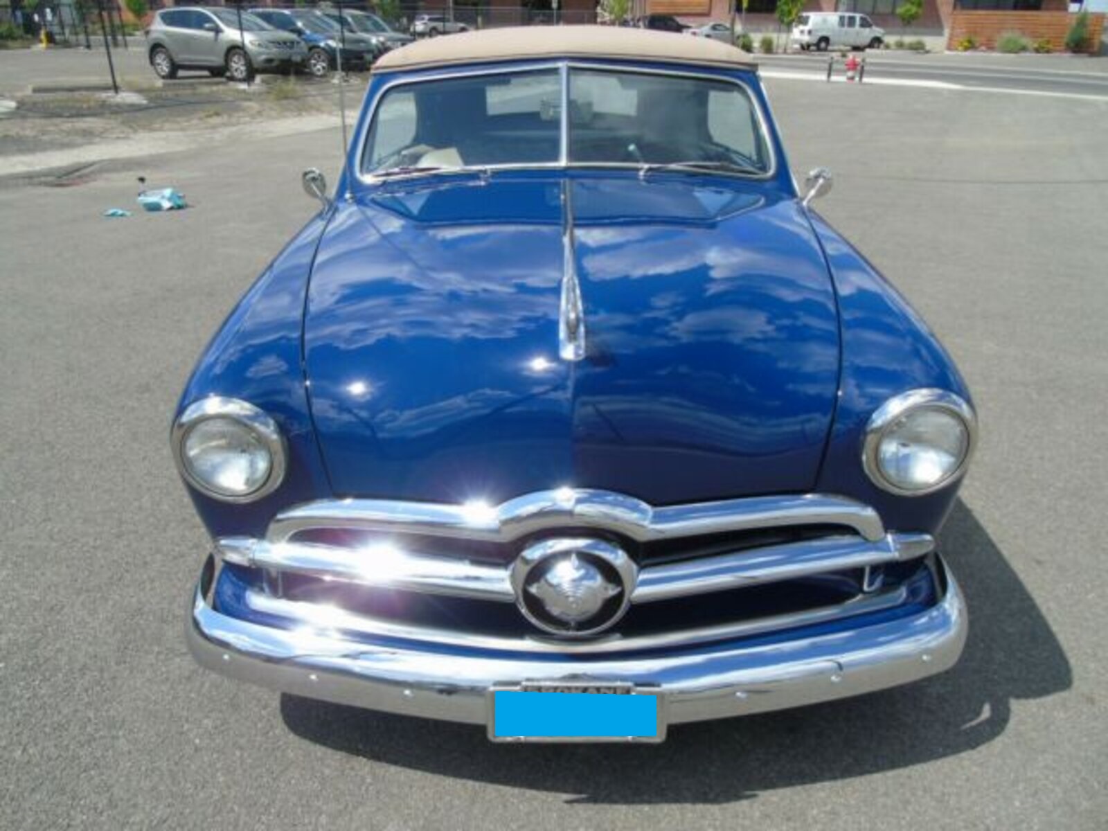 1949 Ford Convertible. Rust free. The top is tan high quality cloth with boot. The interior design is the same as original, but using a combo of high quality vinyl and cloth. The dash was customized with metal added to the bottom to accommodate the AC vents and blends really nicely. After market custom gauges, Cold AC with tilt column. Digital clock and AM/FM stereo with stock face. PS, PB and power top. Cut down steering wheel. 289 30 over, aluminum intake with Holley, MSD ignition with nice street cam. The trans is a C4 with an 8 inch rear end out of a Maverick with hiway gears. Power disc and drum rear with Master cylinder and booster mounted to frame. Factory 15 inch steel wheels with trim rings and caps. Radial tires are Coker 205/75 15 in like new condition. Great condition.