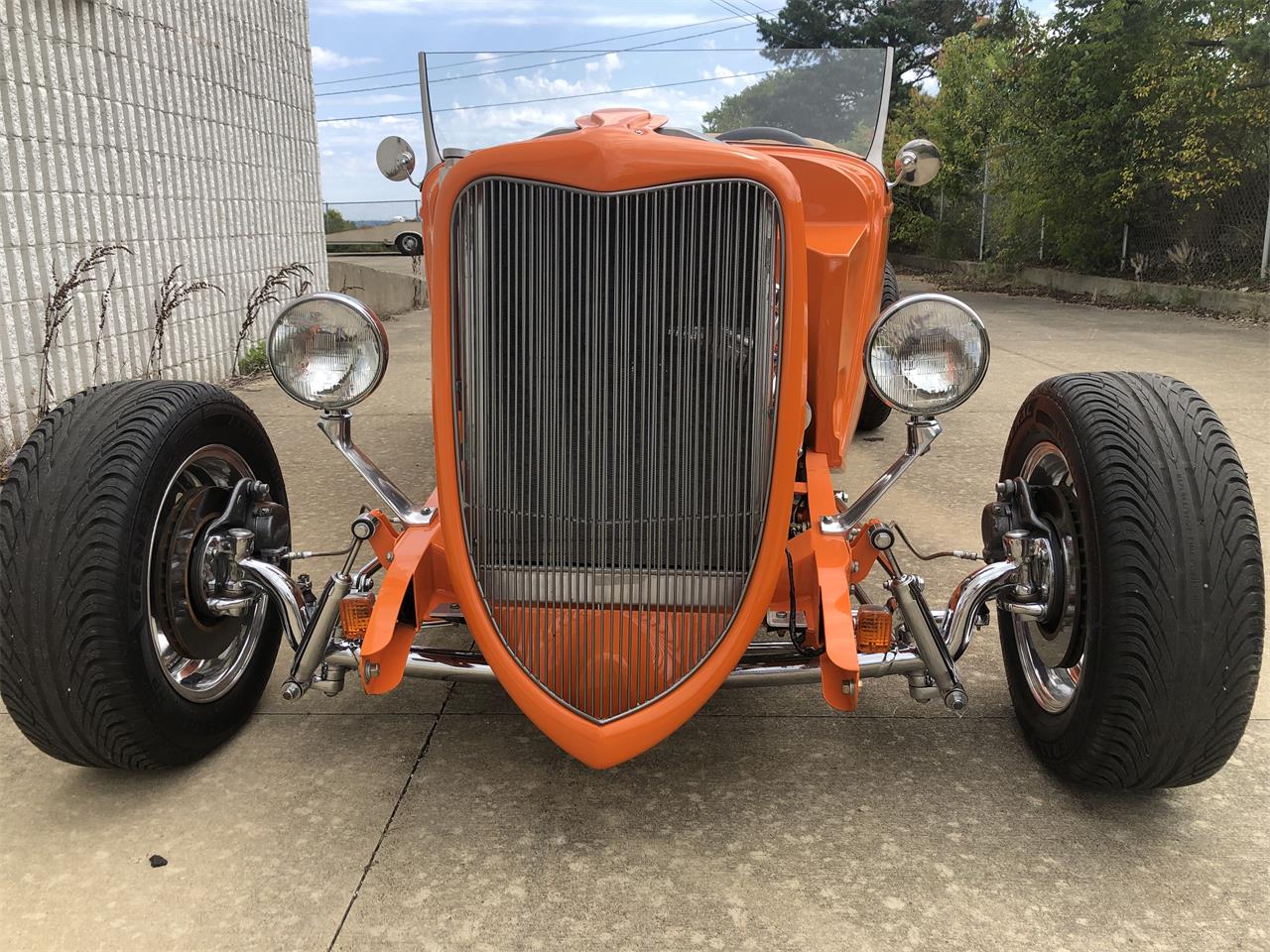 This striking 1934 Ford Roadster Hot Rod reproduction is an eye-catcher with a bright orange exterior, green trim and tan leather seats. Fiberglass body, electronic trunk lid and rack and pinion steering. For added safety, it offers a wide and deep body, front 205 and rear 255 General Tires and 4-wheel disc brakes.