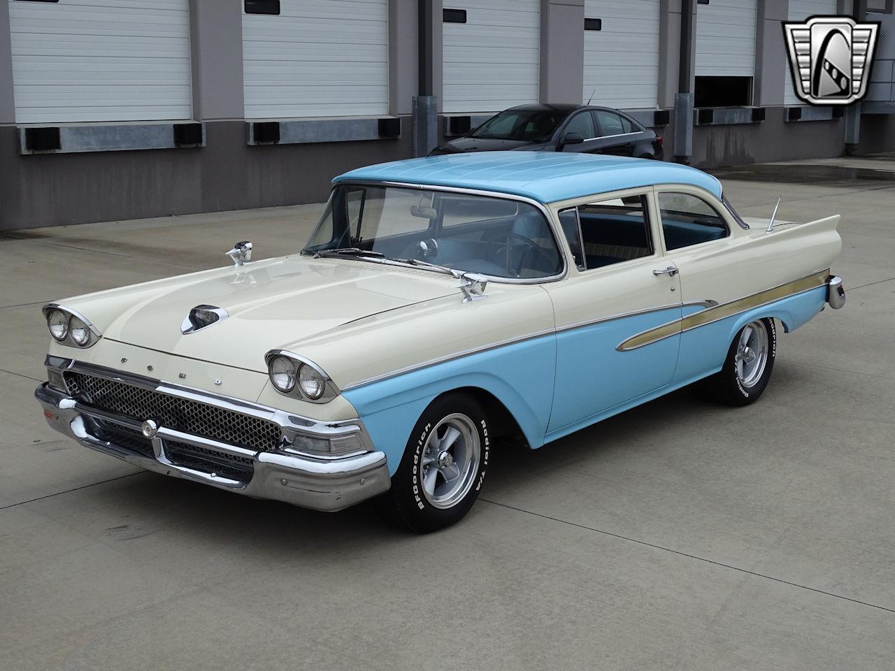1958 Ford Custom 300 Hot Rod. She is detailed in epoxy red oxide primer, with new fuel tank, and lines, 1955 Chevrolet power steering box, front disc brakes, ladder bar suspension out back w/ 9" Posi-Traction 3:70 rear end, coil over shocks at all 4-corners, and large diameter front/rear sway bars! Painted in a 2-tone 2-stage Blue-White-Blue paint scheme from her vintage. The trim and bumpers all original - and in very good condition with minor patina. Under the hood sits a rebuilt 1966 Mercury 410 Big Block, which is a 390 block that Mercury then implanted a 428 crank into, that has an aluminum intake w/ a Holley tri-power sitting on top! Mated to a rebuilt top-loading wide ratio 4-speed w/ Hurst shifter, to the new Ford 9". The next high-light is the sound - with a set of long tube headers, w/ exhaust extensions for future open-header times, w/ H-tube, 2.5" exhaust pipes and tail pipes - this thing sounds so - strong! Open the hood, and the engine looks as clean as the rest of the vehicle, with an aluminum radiator, and that Tri-Power set up-just makes the statement! Options for this 1958 300 include; vinyl interior, power steering, disc brakes, Pioneer AM/FM/CD, American Racing Torque Flight wheels w/ BF GoodRich P215/70R15, P295/50R60 Radial T/A tires.