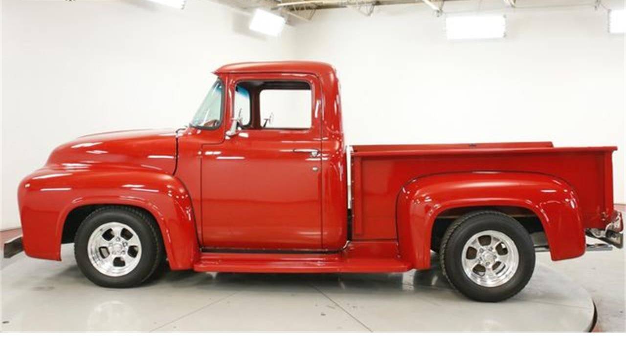 1956 Ford F100 for sale. EXTERIOR: Show Quality matador Red exterior paint, Like new American racing Wheels with good rubber. Excellent chrome throughout., Excellent glass, Dual straight exhaust, Newly finished wood bed with stainless strips. INTERIOR: New Gabes Custom Upholstery, Vintage Air Conditioning,. Factory correct gauges, painted red to match exterior, Lokar shifter, Custom sterring wheel, Newer carpet, Stainless Sterring column and pedals. MECHANICAL: Remarkable Cadillac Vortec Motor, 3.55 Gears, 9" Rear diff, Volare torsion adjustable front end, CPP disc Brakes, Vintage AC.