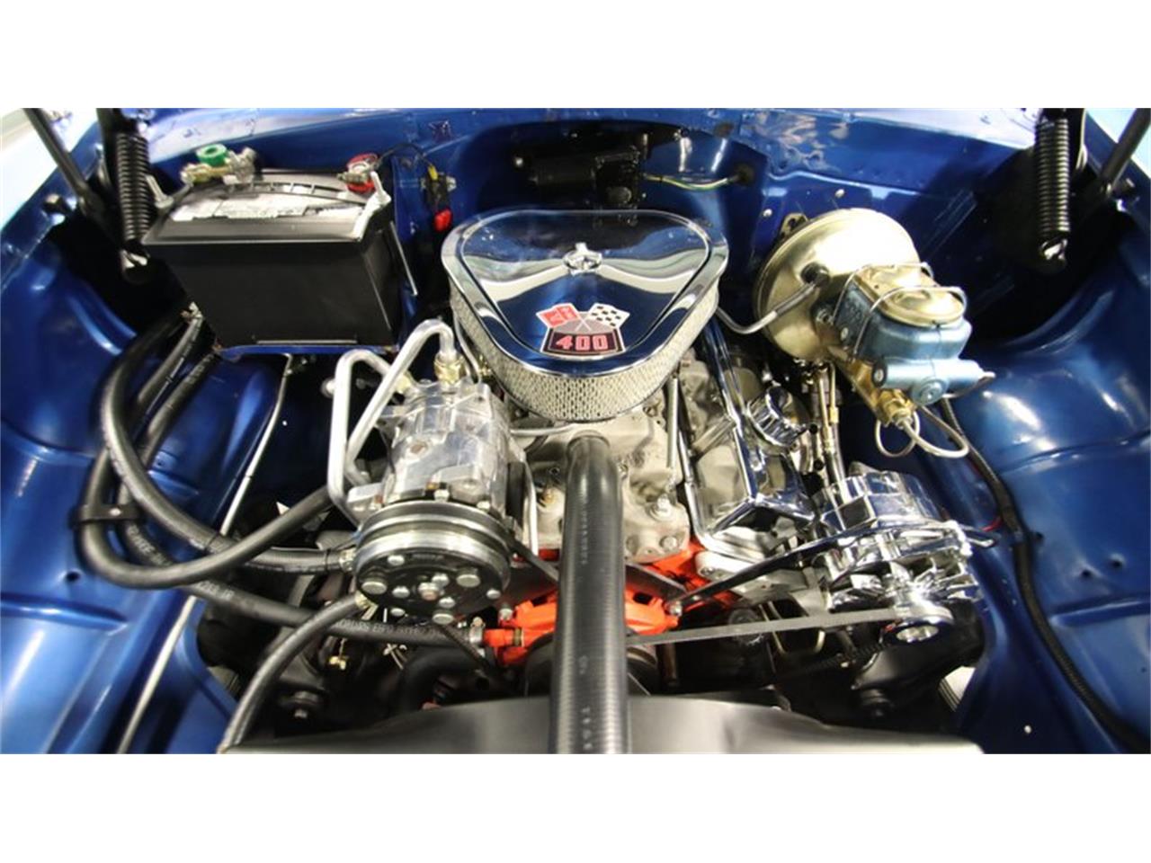 1955 Chevrolet 210 Big 400 cubic-inch V8 power, four-on-the-floor, and a comfy A/C interior make this instantly attractive. Plus, it has been upgraded further with performance components like an Edelbrock 650 CFM four-barrel carburetor, Weiand intake, and ceramic-coated heads feeding an H-pipe dual exhaust. FGour-speed manual transmission. Plus, power steering and power brakes w/discs up front deliver an all-around great driving package. The blue and white theme from the exterior is continued on the seats. These have the classic Del Ray pattern, but the plushness and freshness let you know it's a far more recent investment. This coordinates with the door panels, capering, headliner, and dash to create a terrific uniform feeling inside and out. Upgraded retro-style AM/FM/cassette stereo and cold-blowing R134a air conditioning.