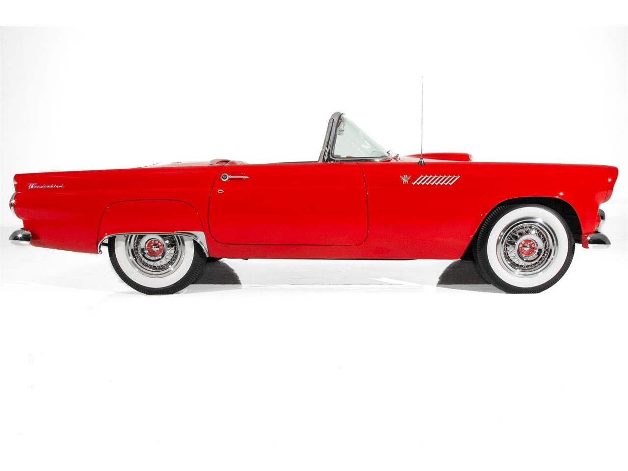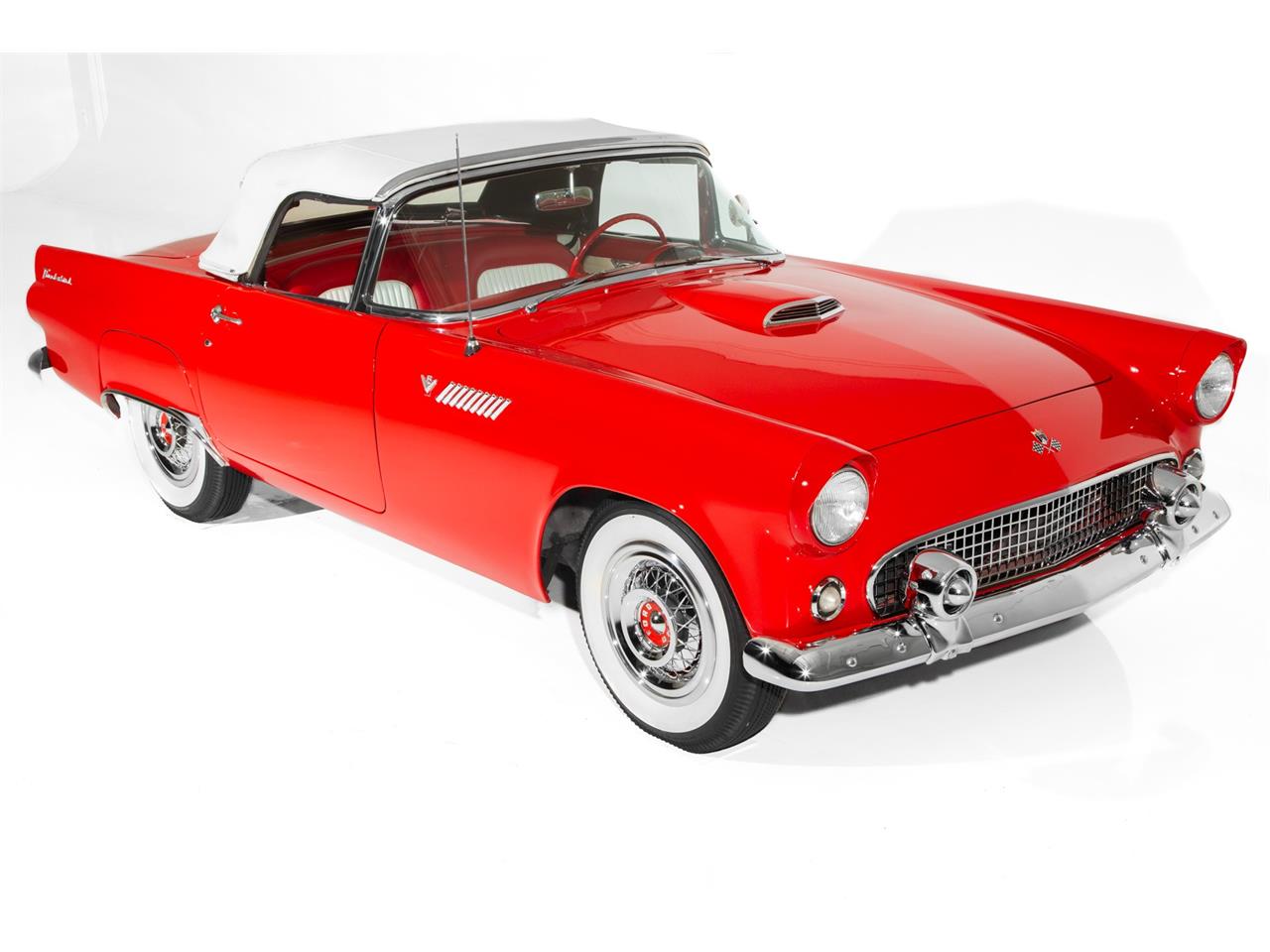 Red 1955 Ford Thunderbird convertible with V8 power and automatic transmission. The paint is smooth with a deep glossy finish and covers a super solid body with very good metal structure. The convertible top is great and bright white. 292 V8 engine Correct chrome air cleaner Finned aluminum Thunderbird valve covers Automatic transmission Stock rearend with highway gear.
