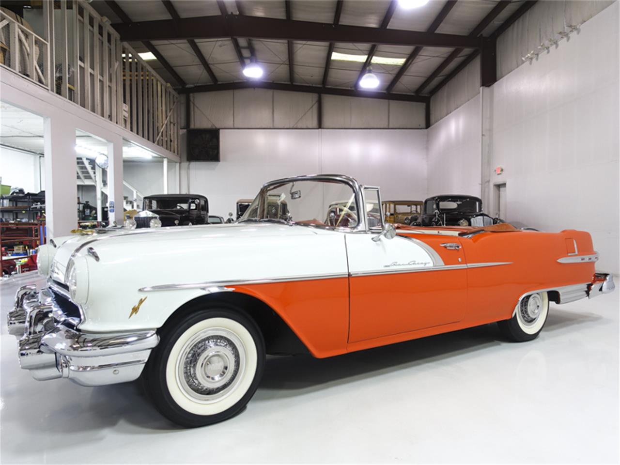 The stunning 1956 Pontiac Star Chief Convertible featured here is finished in the stunning color combination of Polo White over Bolero Red with a matching ivory and red interior and white power folding convertible top.