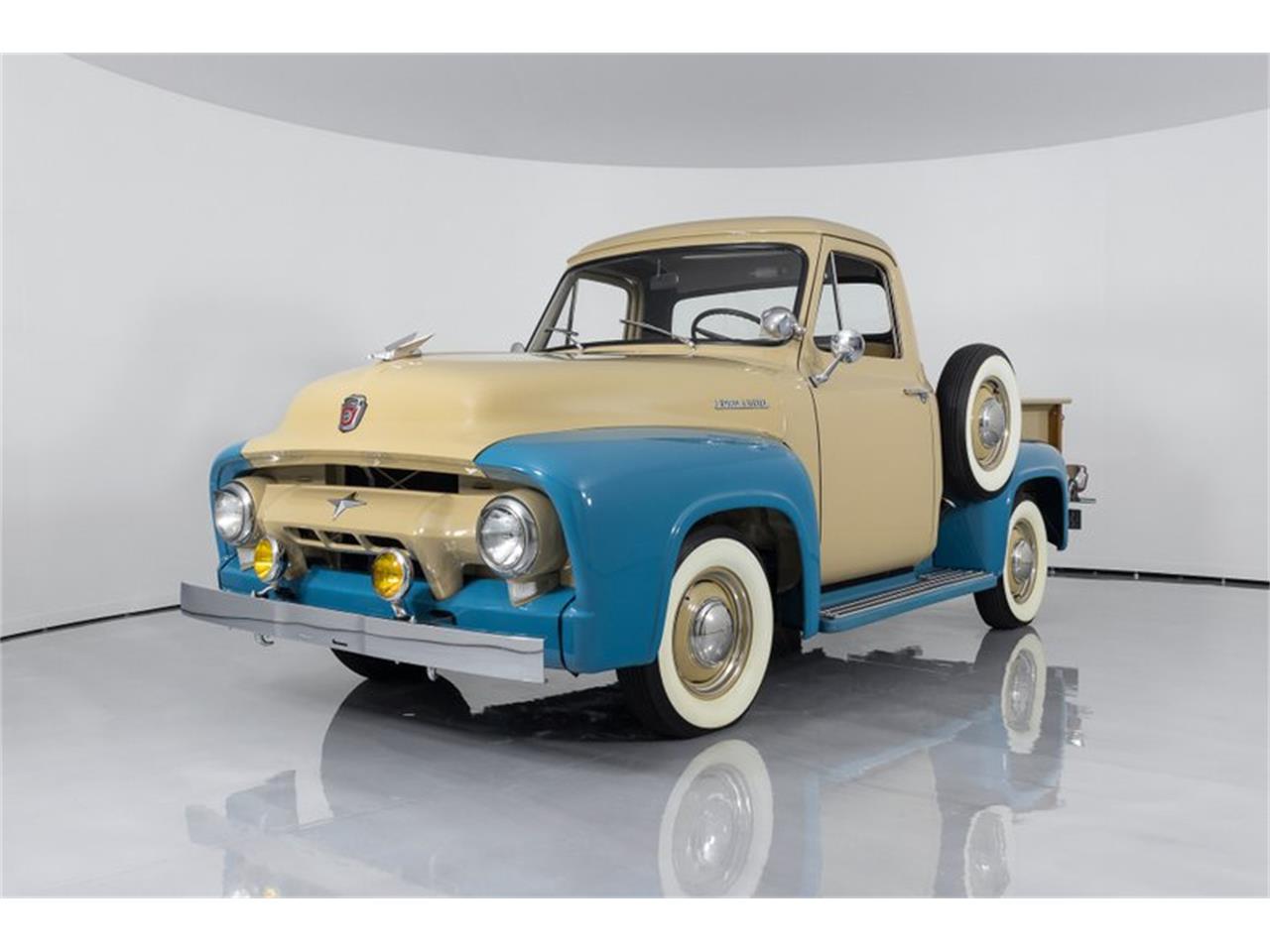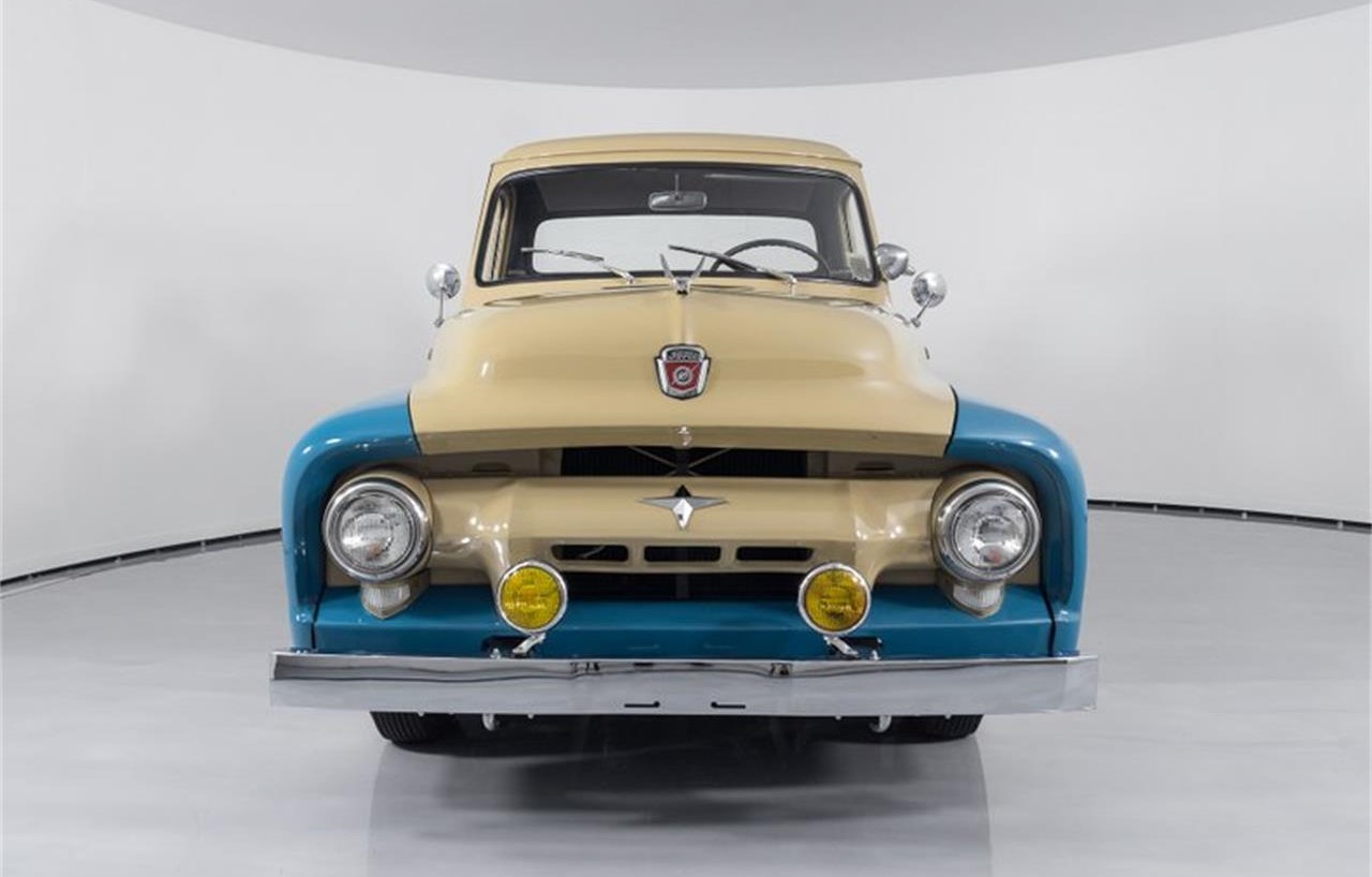 This 1954 Ford F100 Pickup for sale has a 223 C.I. Inline 6 Cylinder, 3 Speed Manual Transmission, Dana 44 Rear 2.72 1 Ratio, Photo Documented Body Off Restoration, Detailed Under Carriage and Engine Compartment, Two Tone Interior, Under Dash Heater, New Oak Bed ,Body Colored Slats, New chrome Bumpers, 16 Body Colored Wheels Ford Center Caps and Trim Rings, Wide Whitewall Tires, Single Side Mount Spare, Unity Fog Lights, Spot Light, Block Heater, Front Hinged Hood, Vintage Inspection Sticker, Wonderfully Restored F100 Pickup Many Custom Touches.