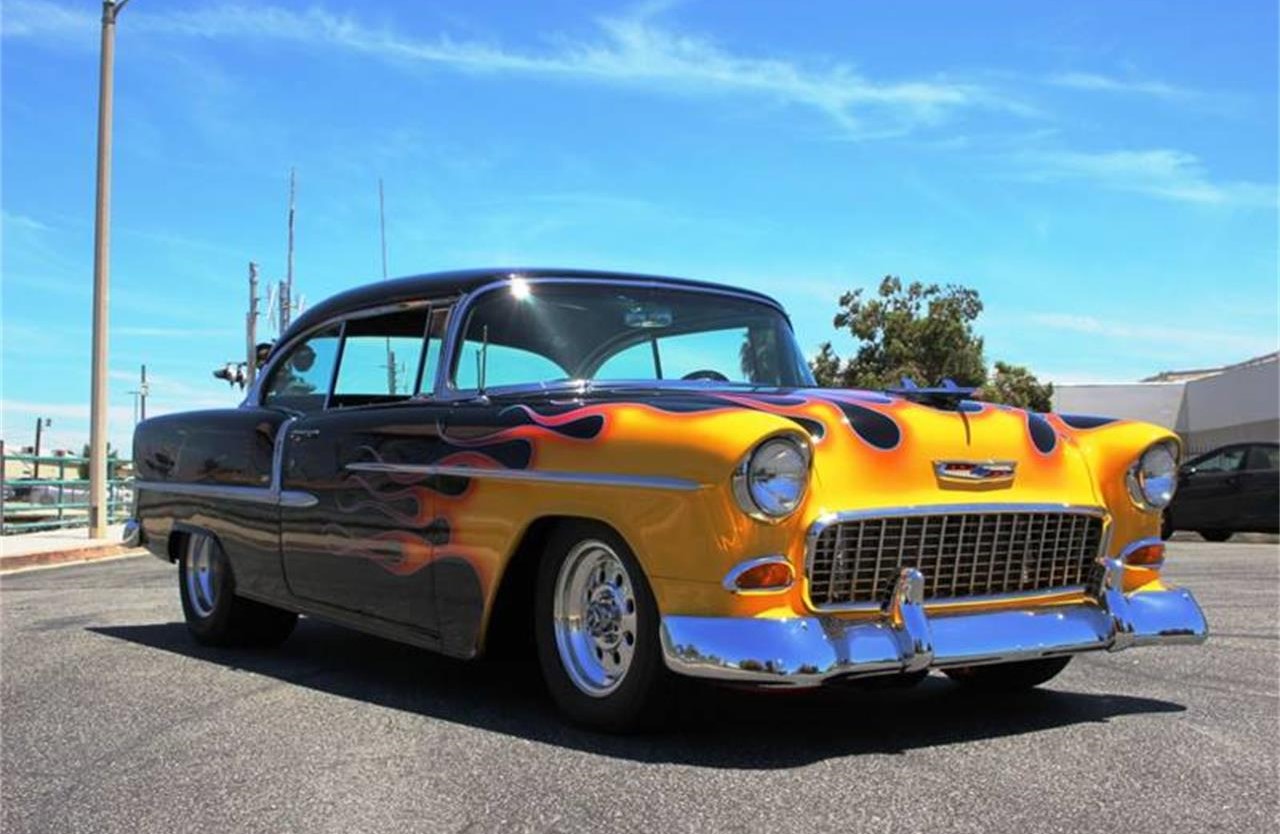 1955 chevrolet bel air professionally built 383ci stroker small block chevy by racing head service. make sure you look at the undercarriage photos.less than 11,000 miles on engine ,stunning black exterior with custom flames, immaculate matching black vinyl interior with red piping front bucket seats for a more sporty feel .
