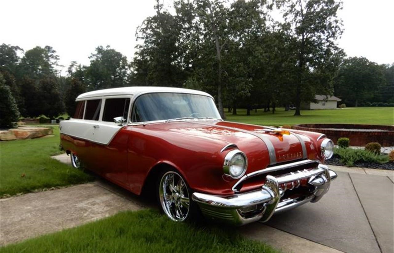 1955 Pontiac Chieftain 2 Door Wagon, Believed By Many to be One of the Prettiest and Rarest Wagons Ever Built. 316 V8 Engine, Automatic, Power Steering, Aftermarket Disc Brakes, Under Dash COLD A C, Air Ride Technologies Air Ride System, LeCarra Billet Leather Steering Wheel, Special Ordered 18 inch Chrome Wheels, Re Done Interior, Every Piece of Chrome, from the Front Bumper, to the Rear Hatch Latches, is either NEW.