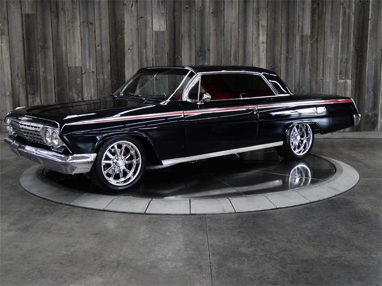 1962 Impala 2 door Custom. Finished in dark midnight blue paint. Complete Frame off rotisserie restoration, new custom red interior with impala logo accents. All New Interior, seats, carpet, door panels, dash, gauges, lenses, carpet Full width Floor Mats etc.