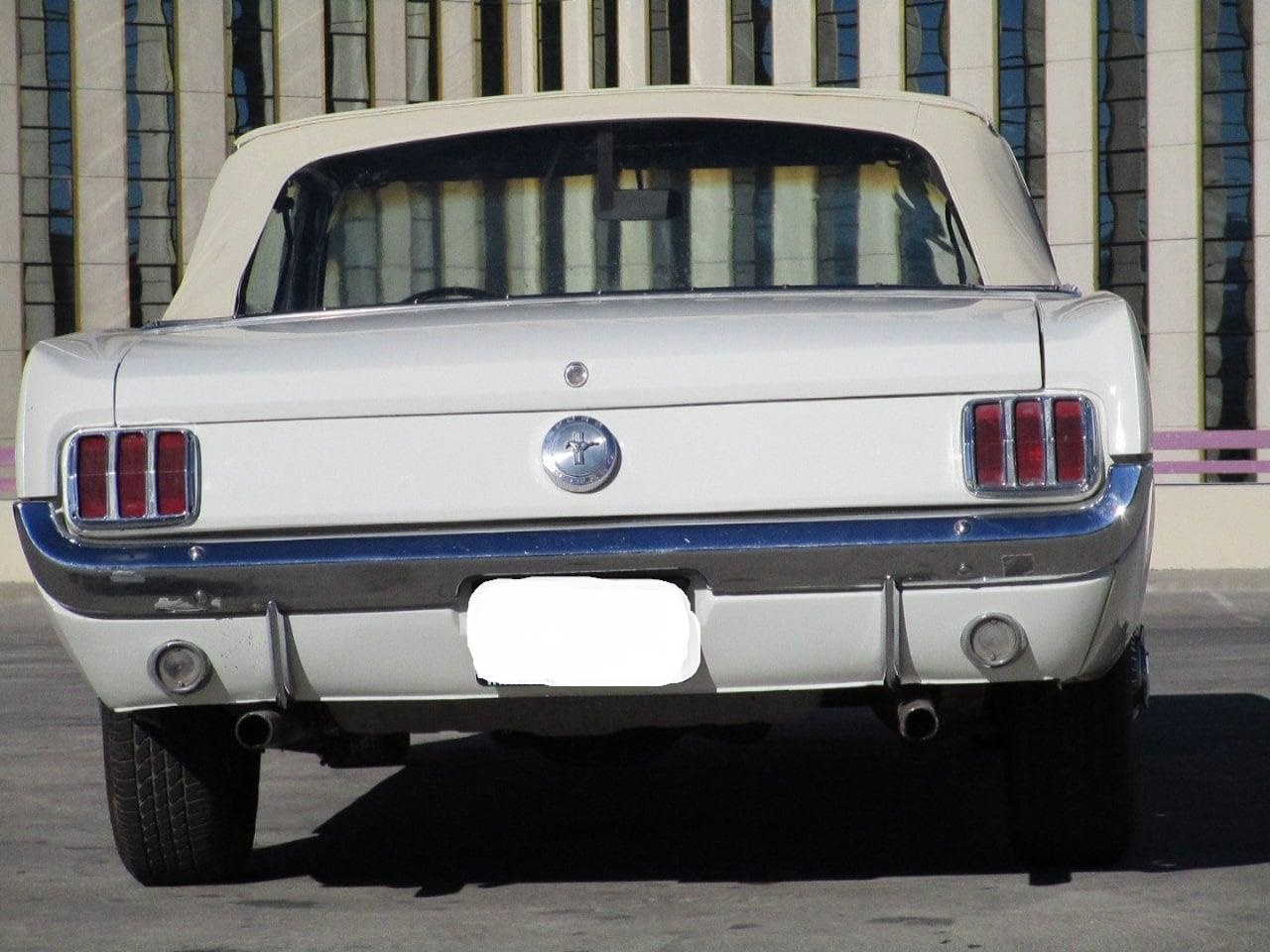 1966 Ford Mustang Convertible. The exterior is the original white paint and is in good condition. The interior is blue and white leatherette bucket seats and is also in good condition.