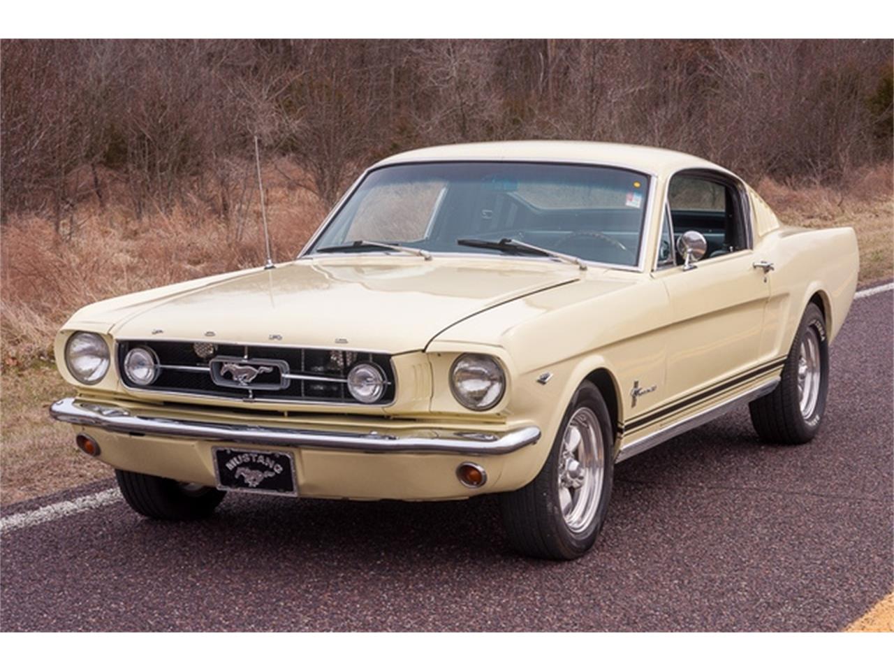 1965 A-code Ford Mustang 2+2 Fastback 289 CID Windsor V-8 engine with a four-barrel carburetor (VIN code A). A- Code Mustang Fastback with some GT equipment (dual exhaust, fog-lights and front disc brakes). Five-speed manual transmission and 3.25 gearing. Correct Springtime Yellow exterior with original black vinyl interior (code 26). Vintage air-conditioning and power brakes with Wilwood front discs. American Racing wheels. Paint and trim are in overall great condition. The body panels are straight. The engine bay is extremely tidy. Full-size spare tire mounted in a steel wheel and a spare tire cover. The chrome bumpers are in very good shape, too. This horse rolls on Cooper Cobra Radial G/T tires, size 235/60R15 in the back, and Cooper ES3 Touring radials, size 205/60R15 in the front. Inside, the car retains its original black vinyl interior (code 26). The black buckets in front and rear bench are in great shape, as are the matching carpet and headliner. The black instrument panel and inner door panels look great.