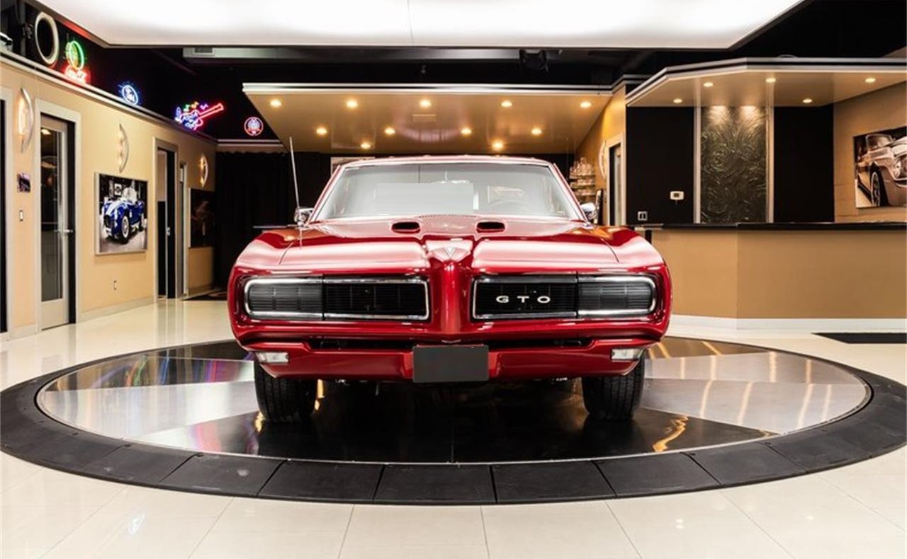 1968 Pontiac GTO. This GTO has a beautifully straight body, Tri Coat Red Paint finish, Black Interior, Hood Scoops, Hideaway Headlights, New Chrome Cragar Wheels, along with Polished Components inside and out that s sure to turn heads wherever you go.