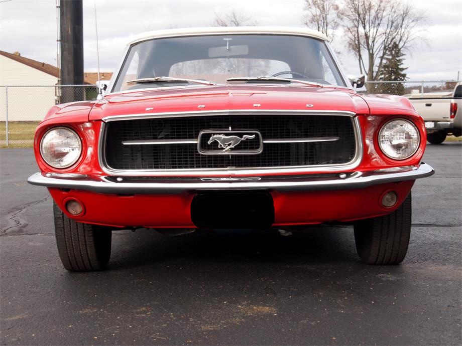 This 1967 Mustang convertible sports bright red paint with black interiorwith sport wheels.