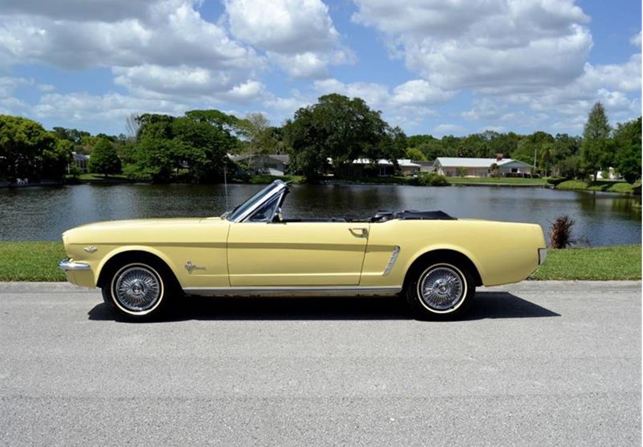 1965 Ford Mustang Convertible. An early production model with the F Code 260 Cubic Inch V8 engine mated to an automatic transmission. Equipped with power steering, generator charging system, factory 14 inch steel wheels with full wire wheel discs with simulated knock off spinners, white wall radial tires, drivers chrome sport mirror, black bucket seat interior, center console with floor shift, AM Radio, and finished in Springtime Yellow with contrasting black power convertible top and black boot. This is the Mustang that the entire world wants.
