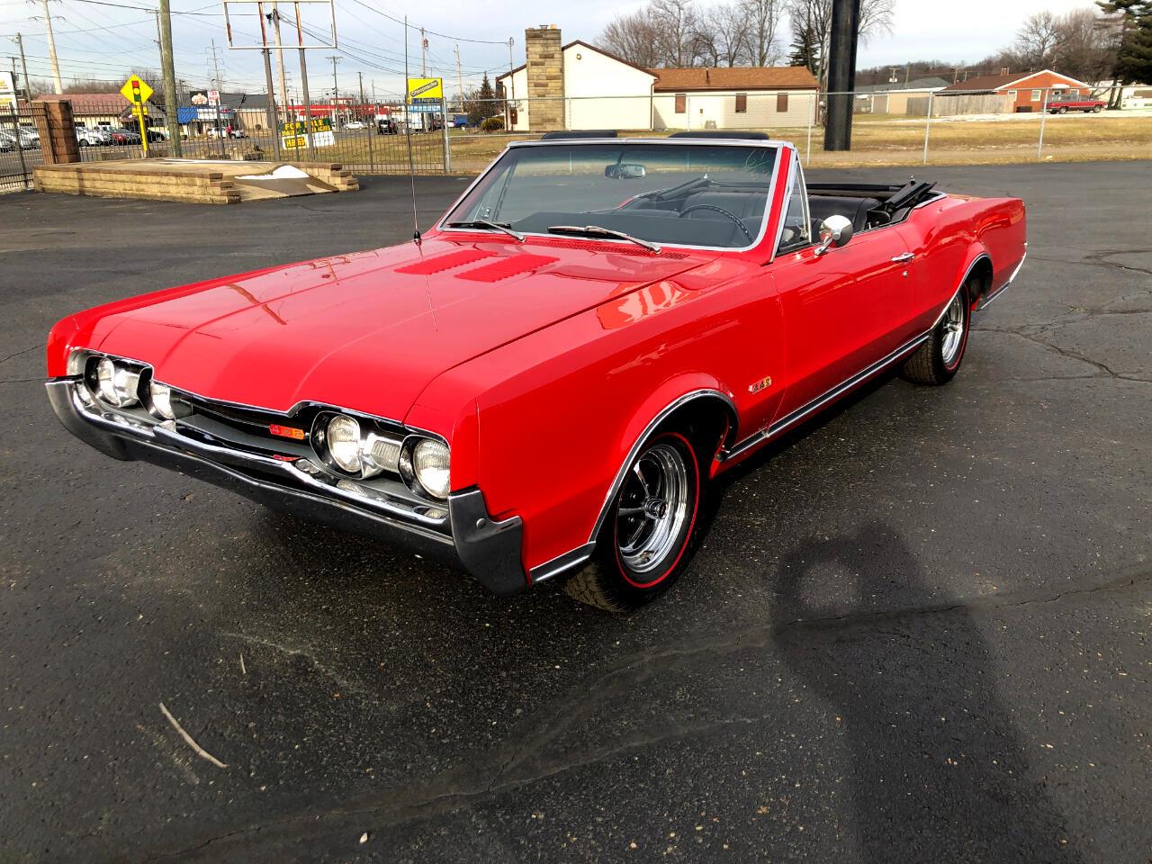 This gorgeous 1967 L78 442 convertible has under gone a meticulous frame off restoration .You ll drool over it s bright red paint coating a laser straight body. The interior has brand new black vinyl bucket seats and console. In addition the dash trim has been replaced. Great options included are the Turbo 400 3 speed automatic transmission power steering power brakes plus a new black power top and that s just to name a few. All the chrome and stainless moldings have been refinished to show quality. You could be riding on red line radial tires with new factory chrome wheels to enhance the ride.