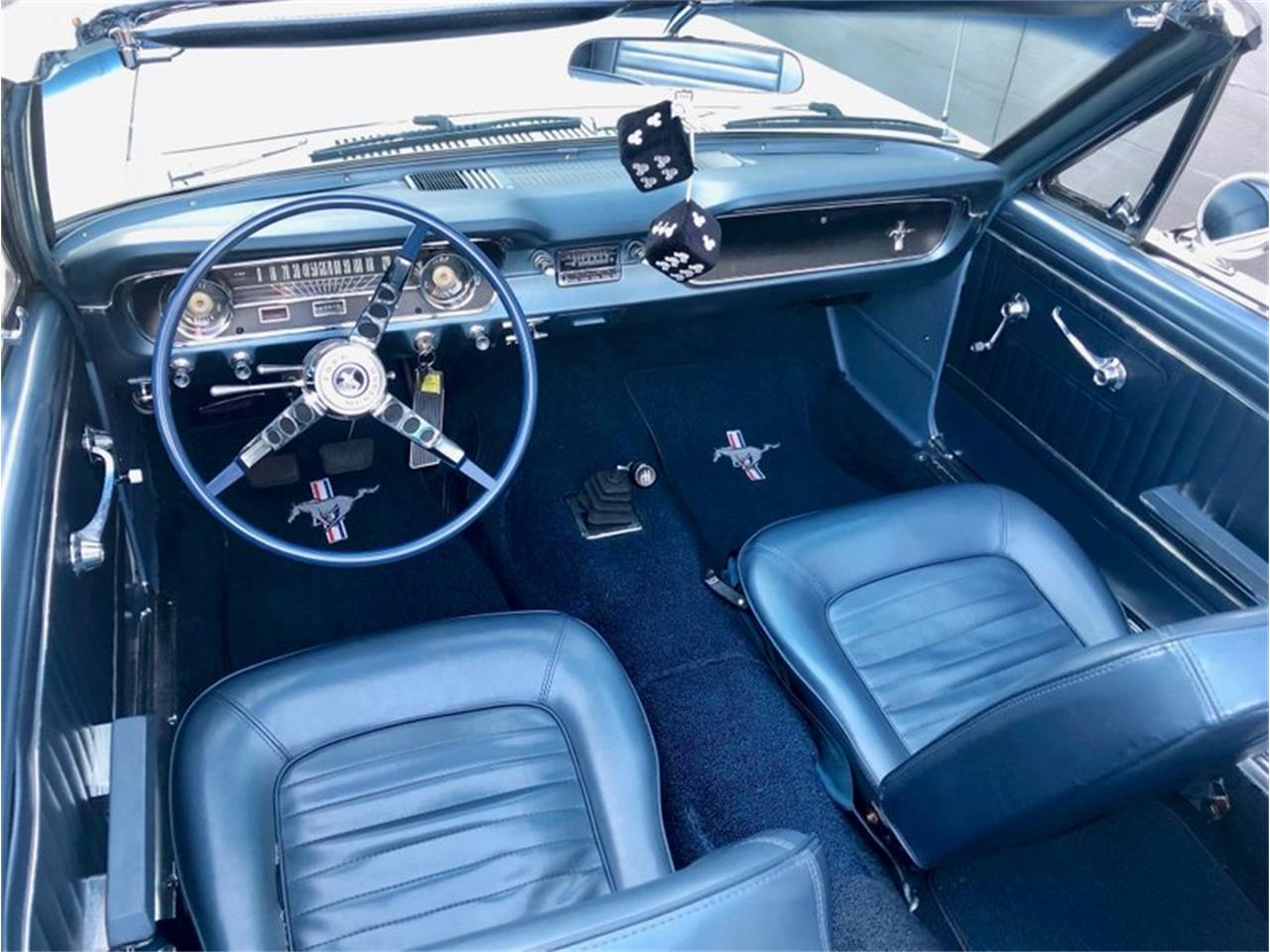 1965 Ford Mustang White 289 V 8 4 Speed Convertible . This is one beautiful Mustang. Very straight body and excellent paint. It s white with blue interior and blue top. All the chrome and trim is excellent. Style steel wheels with white wall radial tires with good tread. It looks like the Mustang was hit way back at some time on the left side.