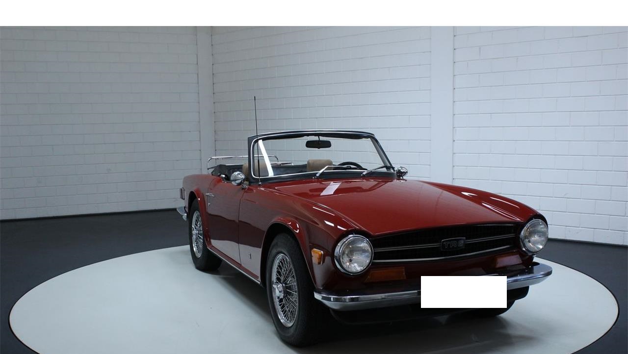 Triumph TR6 1973 chrome wire wheels. This Triumph is equipped with its correct type 2.5 liter 6-cylinder engine and a manual gearbox. The beloved beautiful burgundy red colour combines well with the beautiful brown interior. This TR6 has chrome details, such as chrome wire wheels and a chrome luggage rack.