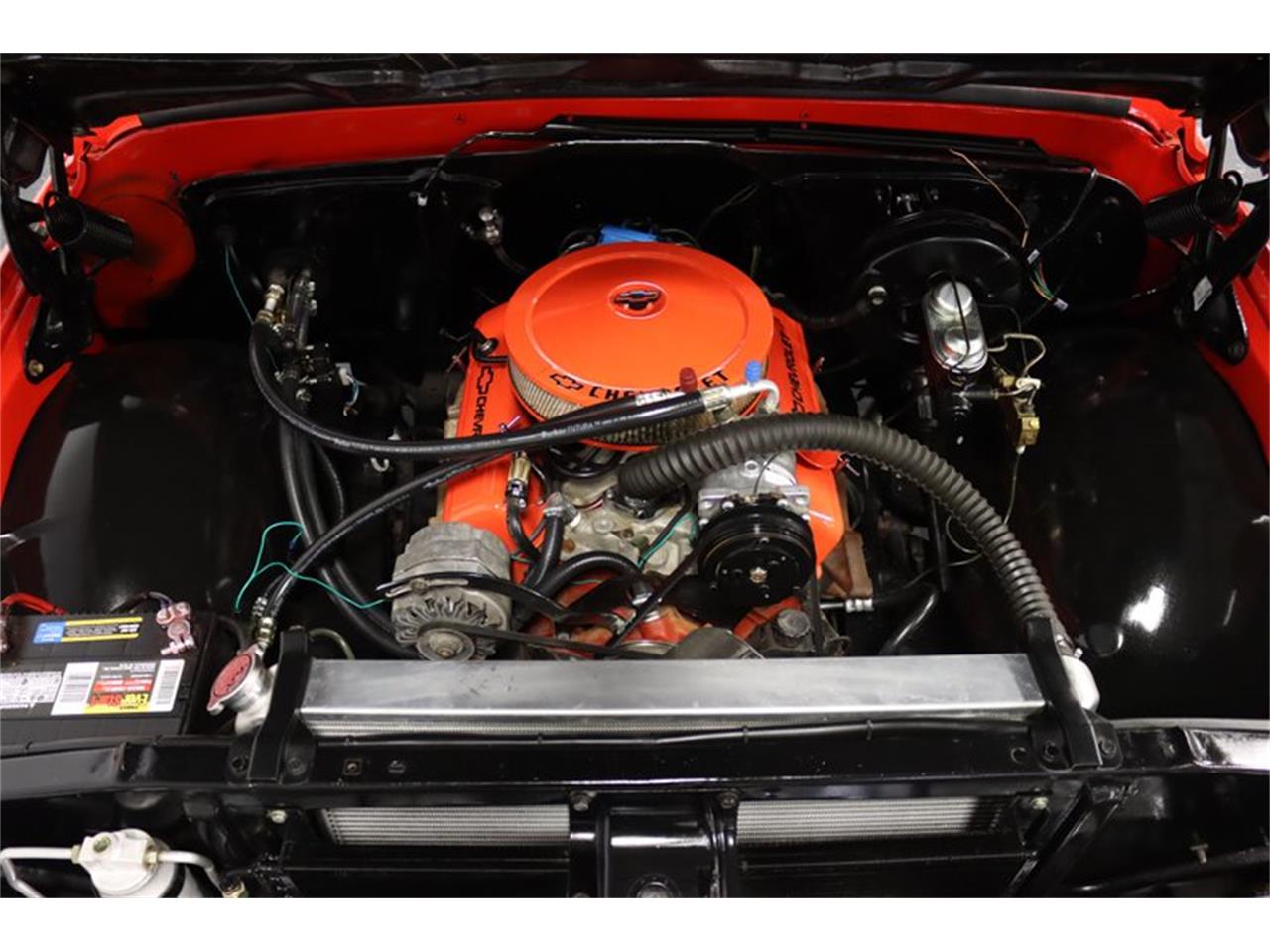 A later-model 350 cubic inch V8 crate motor was dropped in and is really running superbly today. It's not radical or high strung, so it's very user-friendly, and the Chevrolet Orange dress-up pieces make it look great in the otherwise glossy black engine bay. Chevy Orange paint on the block reinforces the fact that this is a pretty stock build, and just about everything under the hood looks new or serviced, including the A/C compressor, power brake booster and master cylinder, and the aluminum radiator that keeps the whole show nice and cool. It's backed by a TH350 3-speed automatic transmission and a heavy-duty 12-bolt rear end that hangs on factory heavy-duty springs.