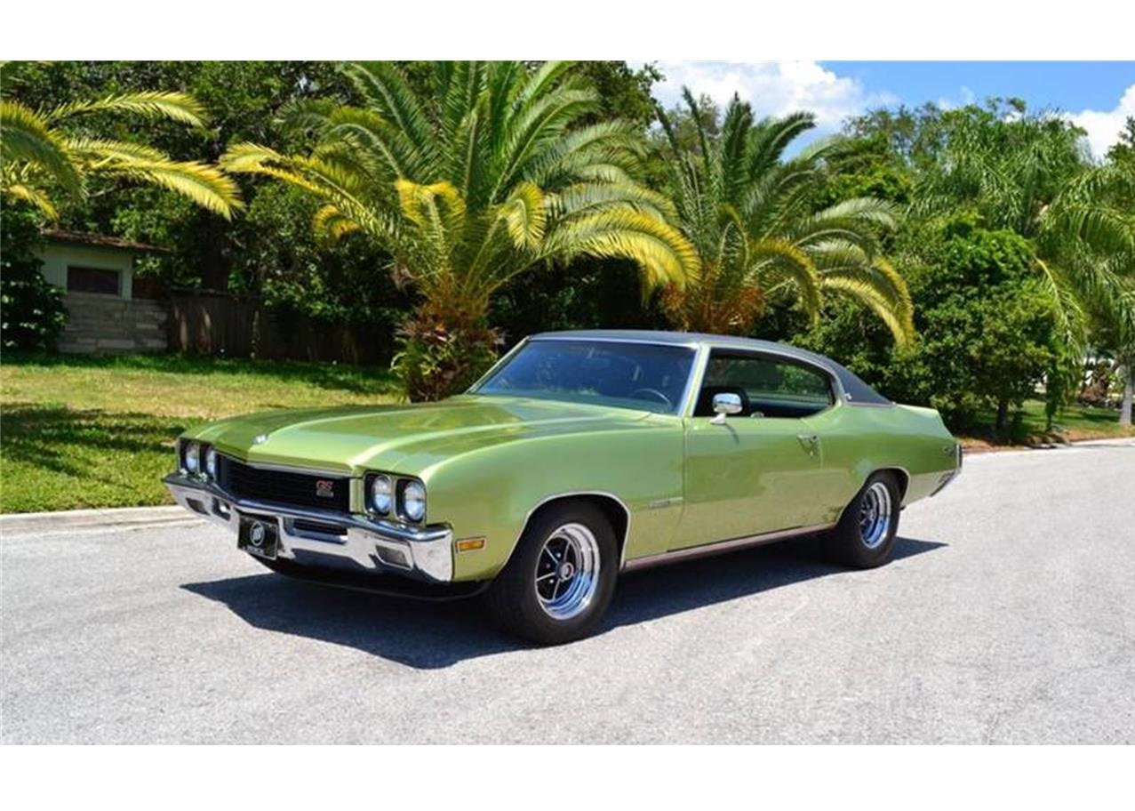 1972 Buick Skylark GS Stage 1 Tribute, 455 Cu In V8 engine. Equipped with electronic ignition, ceramic coated headers, aluminum intake, 4 barrel carburetor, dual exhaust, Tremec TKO 600 5 speed manual overdrive transmission. Suspension with Hotchkis lowering springs, KYB Shocks, boxed rear control arms, front power disc brakes, power steering, 3.73 rear gear with Eaton Posi unit, detailed undercarriage, 15" Buick Rally Wheels, original vinyl top, chrome sport mirrors, beautiful Sea Mist Green exterior, 6 way power bench seat interior, detailed instrument panel, AM radio.
