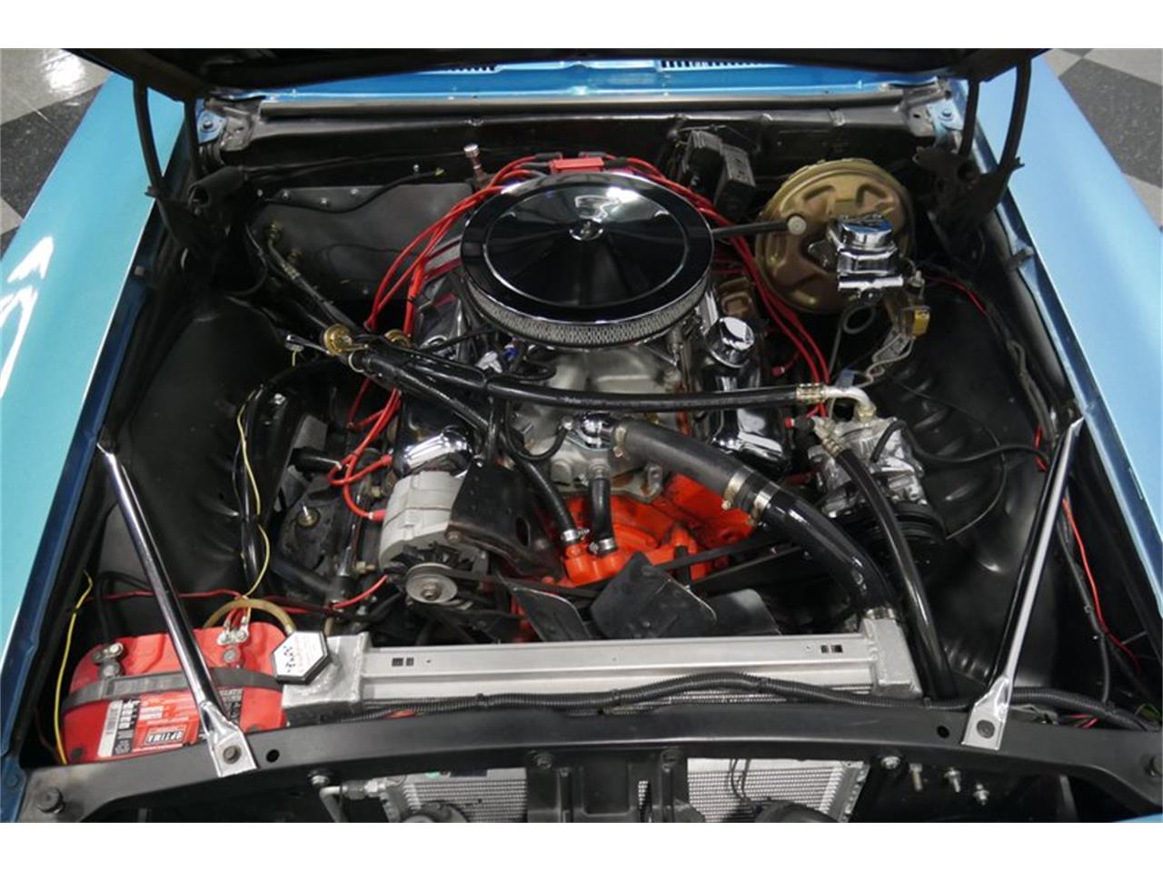 This Camaro looks quite nice in blue. It's a glossy finish that likes to highlight the crisp body panels. There's also a well-coordinated dark side with a blackout grille, deep chin spoiler, dark tail panel, and this iconic hockey stick stripes that highlight the sleek design as they run down the door line. As a proper Super Sport tribute, this has some of the best SS elements of a first-gen Camaro, including the faux velocity stack hood and full-width rear spoiler. Cold-blowing R134a air conditioning is another worthwhile upgrade. Plus, the AutoMeter Sport-Comp auxiliary gauges are a clear indication you're going to like what's under the hood even before you twist the key and hear it roar. The 454 cubic-inch V8 looks nice with the bold block, shining valve covers, and matching air topper. It inhales deeply with a Holley four-barrel carburetor, and it exhales with authority as headers add power while contributing to the rumble of the dual exhaust. Plus, you have the right supporting components, like an aluminum radiator, HEI distributor, brake booster, master cylinder, and Optima red top battery.