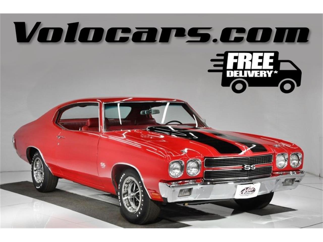 The poster child of the muscle car era- a red 1970 Chevelle SS 454 with black stripes.