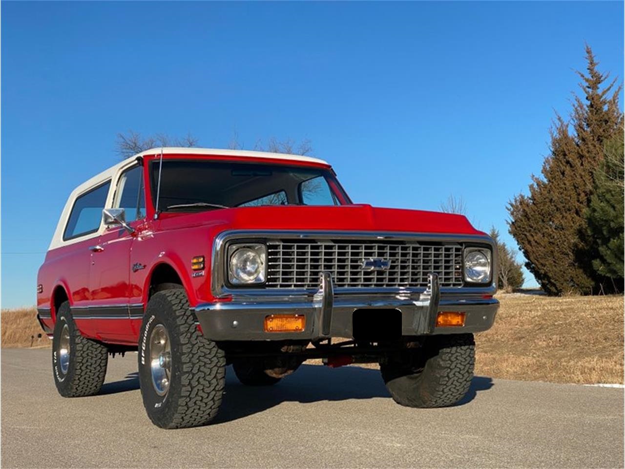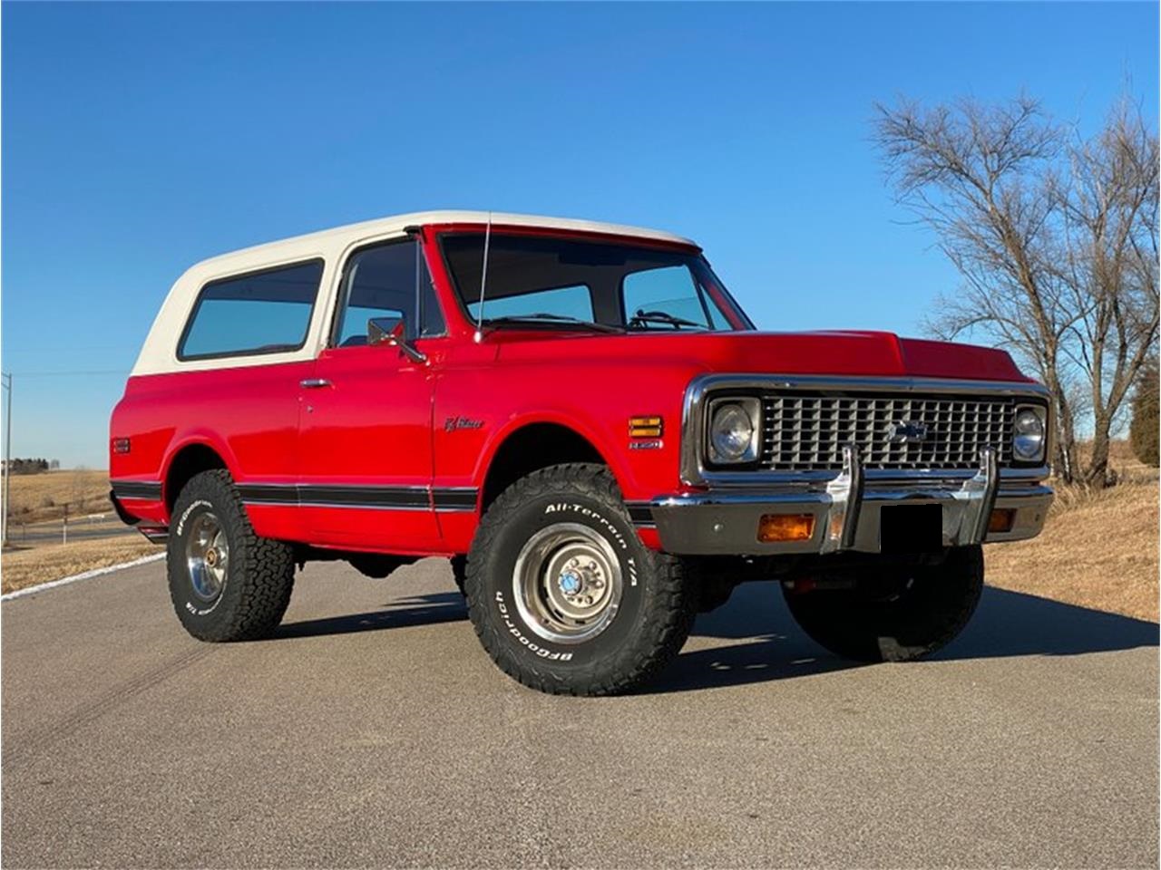1972 Chevrolet Blazer. It is finished in Bright Red that looks good enough to eat. The bumpers have been rechromed and look beautiful. The interior is upholstered in a very unique plaid interior. It is powered by a strong running 350ci \ 5.7L V8 and this is mated to a smooth shifting Automatic Transmission. The engine compartment is fully detailed. It rides on New factory 15x8 Truck Rally Wheels and New BFG 33x12.50R15LT tires. It is equipped with Power Steering, Power Brakes, Tinted Glass, Locking Hubs and much more.