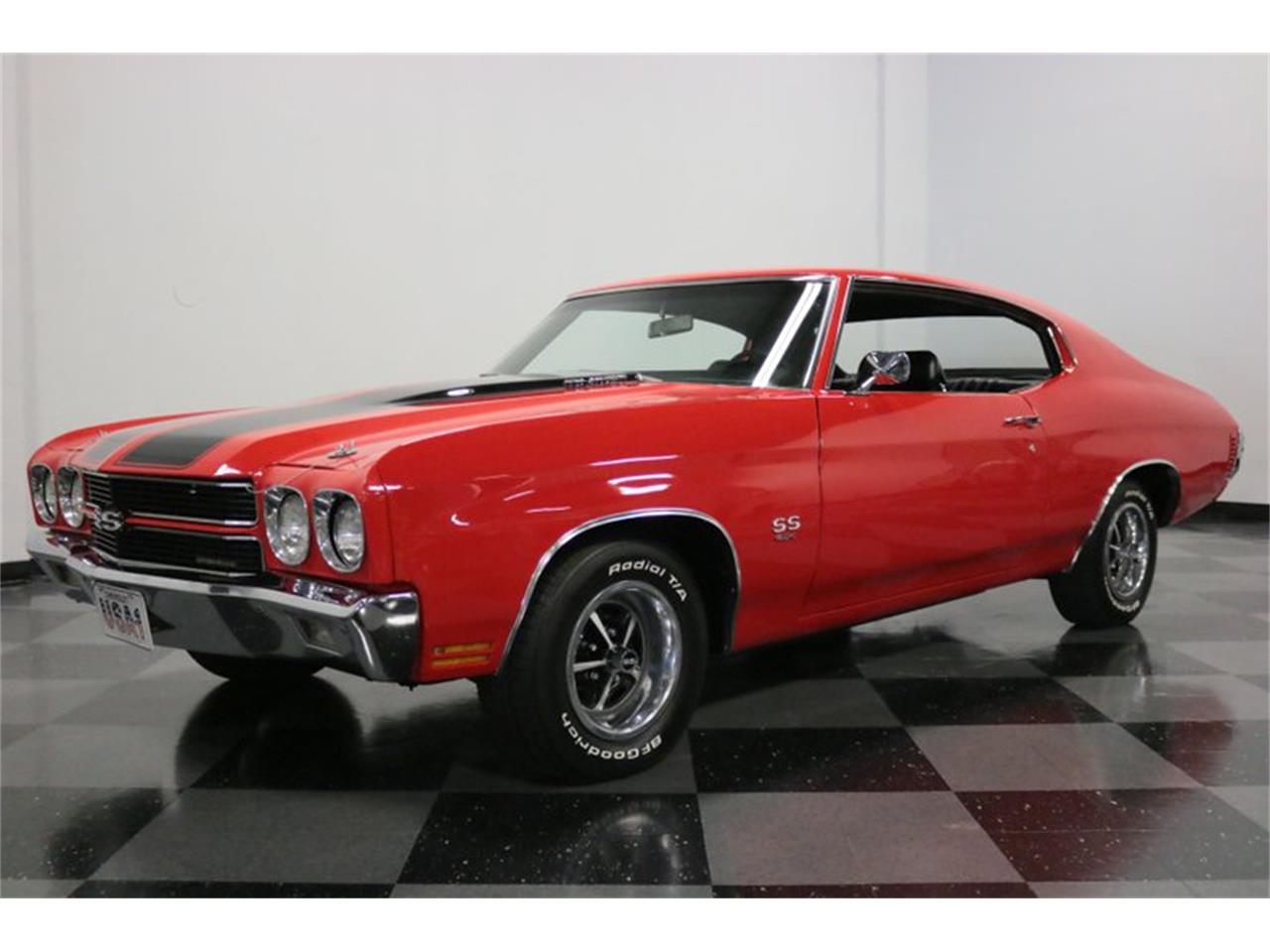 1970 Chevrolet Chevelle. The engine is a 454 cubic inch big block V8 with a healthy lope, and it runs fires right up and runs beautifully today. Performance upgrades include an upgraded intake, Holley 4-barrel carb, HEI ignition and long-tube headers to free up a few ponies. That potent big block is ably supported by a TH400 3-speed automatic turning a durable 12-bolt rear with reasonable inside, which means this 1970 can be driven at modern speeds without issue.The chassis is shockingly clean and solid, and the exhaust system features Flowmaster mufflers with turn-downs just under the rear bumper. It rides on a set of correct SS mag wheels wearing 215/70/14 BFGoodrich white-letter radials. The factory-style black bucket seat interior also accurately duplicates the SS look. Correct seats, nice seat covers, proper black carpets, and even correct door panels make it look and feel just like 1970 inside.