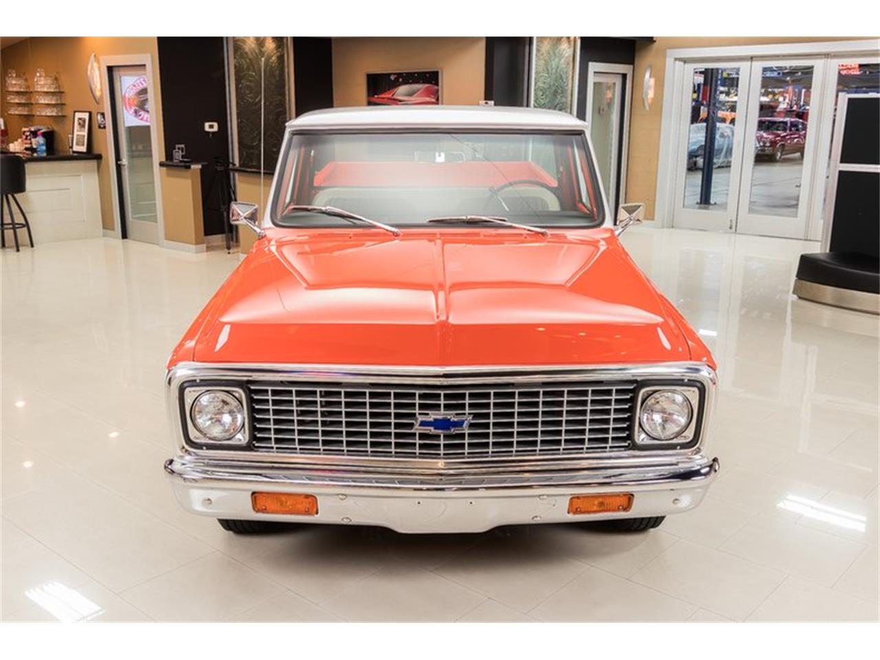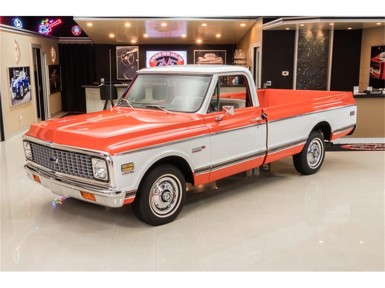 Check out this awesome 1971 Chevrolet C-10 Cheyenne Pickup! This Cheyenne has a beautifully straight body, glossy Orange and White Paint finish, White Houndstooth Interior, Wood Bed, Whitewall Tires, Dual Exhaust, and Polished Components all over that's sure to grab attention wherever you go.