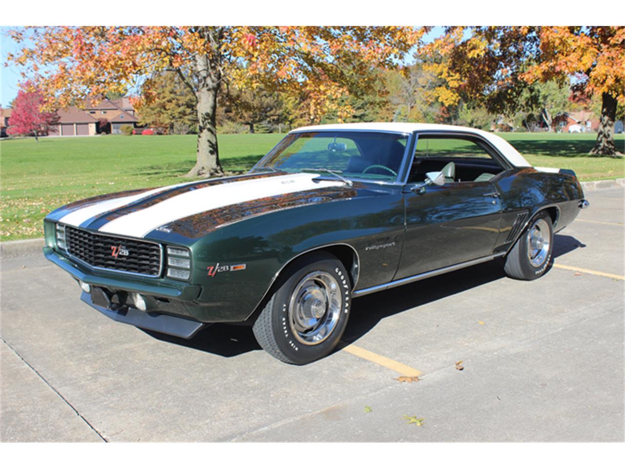 1969 Camaro Z28 RS. Fathom Green with rare Parchment vinyl top, Green standard interior. Real deal Z28 with factory Rally Sport.