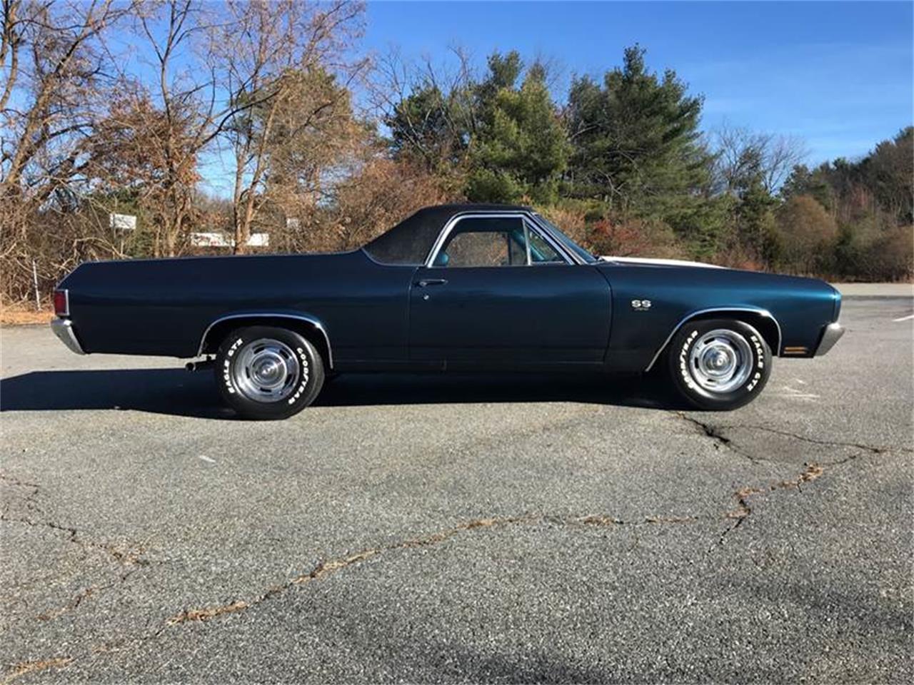 1970 Chevy El Camino SS. 396 v-8, mated to a 4-speed manual transmission. The exterior paint is fathom blue, with white stripes, and black vinyl roof. The paint, and body are real nice !! The exterior is blue vinyl, and has the correct tach dash. This El Camino runs and drives GREAT.