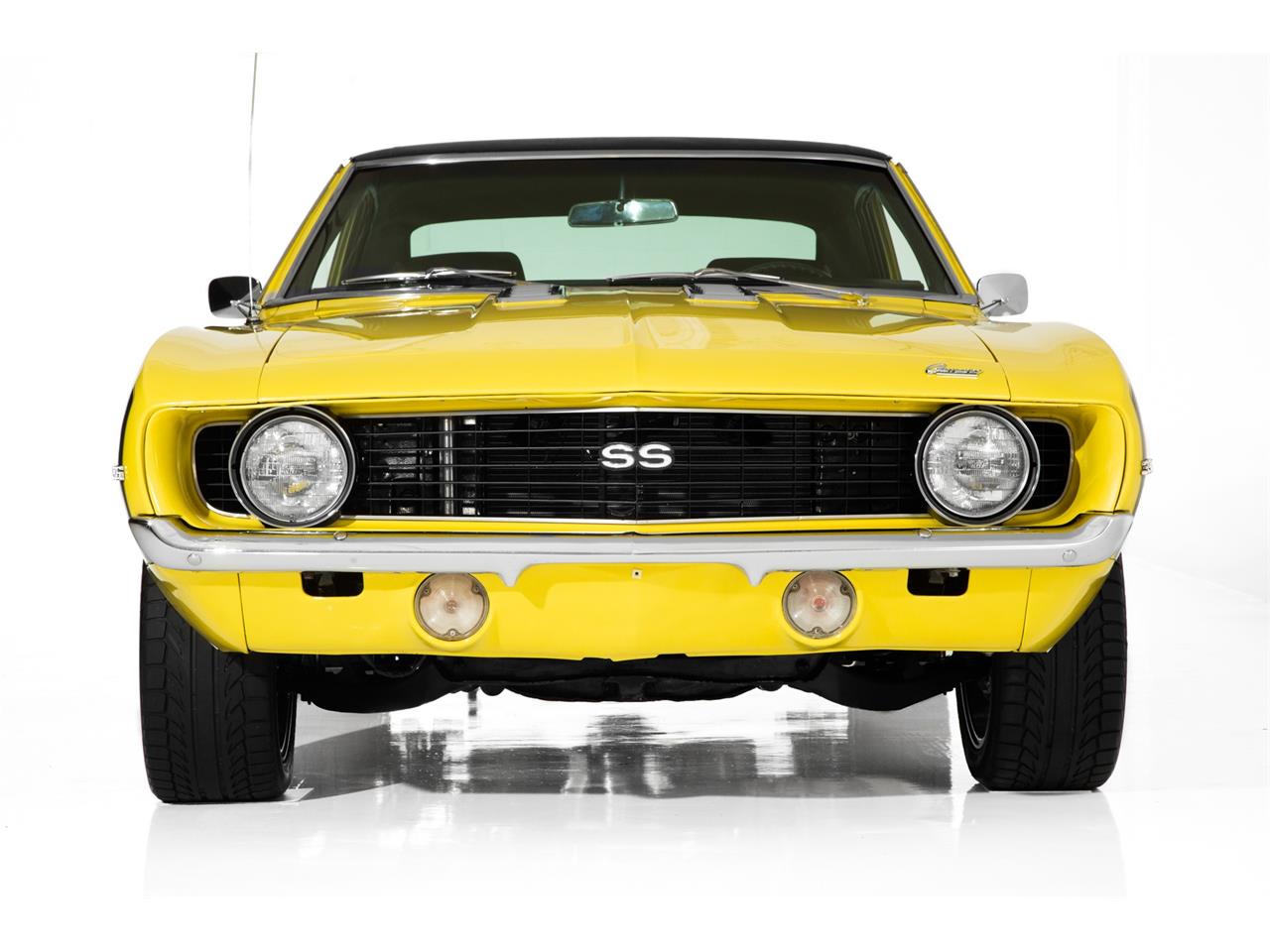 Daytona Yellow 1969 Chevrolet Camaro Super Sport with 396 c.i. big block power, Muncie 4 speed transmission, power steering, power front disc brakes and a 12 bolt rear end. Surrounding the slick paint is a SS hood with chrome stacks, front and rear spoilers, black hockey stick side stripes, black vinyl top. The big block under the hood is dressed up with chrome valve covers, air cleaner, alternator, water pump and power steering pump for a show quality appearance. High capacity Be Cool aluminum radiator keeps things cool. Exceptionally nice interior with factory bucket seats, center console with Hurst shifter and gauges, factory tach, tilt steering column, cushion grip steering wheel and Retro sound with rear mounted speakers. The trim tag on this American Dream Machine is stamped as an X11 code. Rolling on 17 inch Legend Series Vision chrome wheels and BF Goodrich performance tires that really shine.