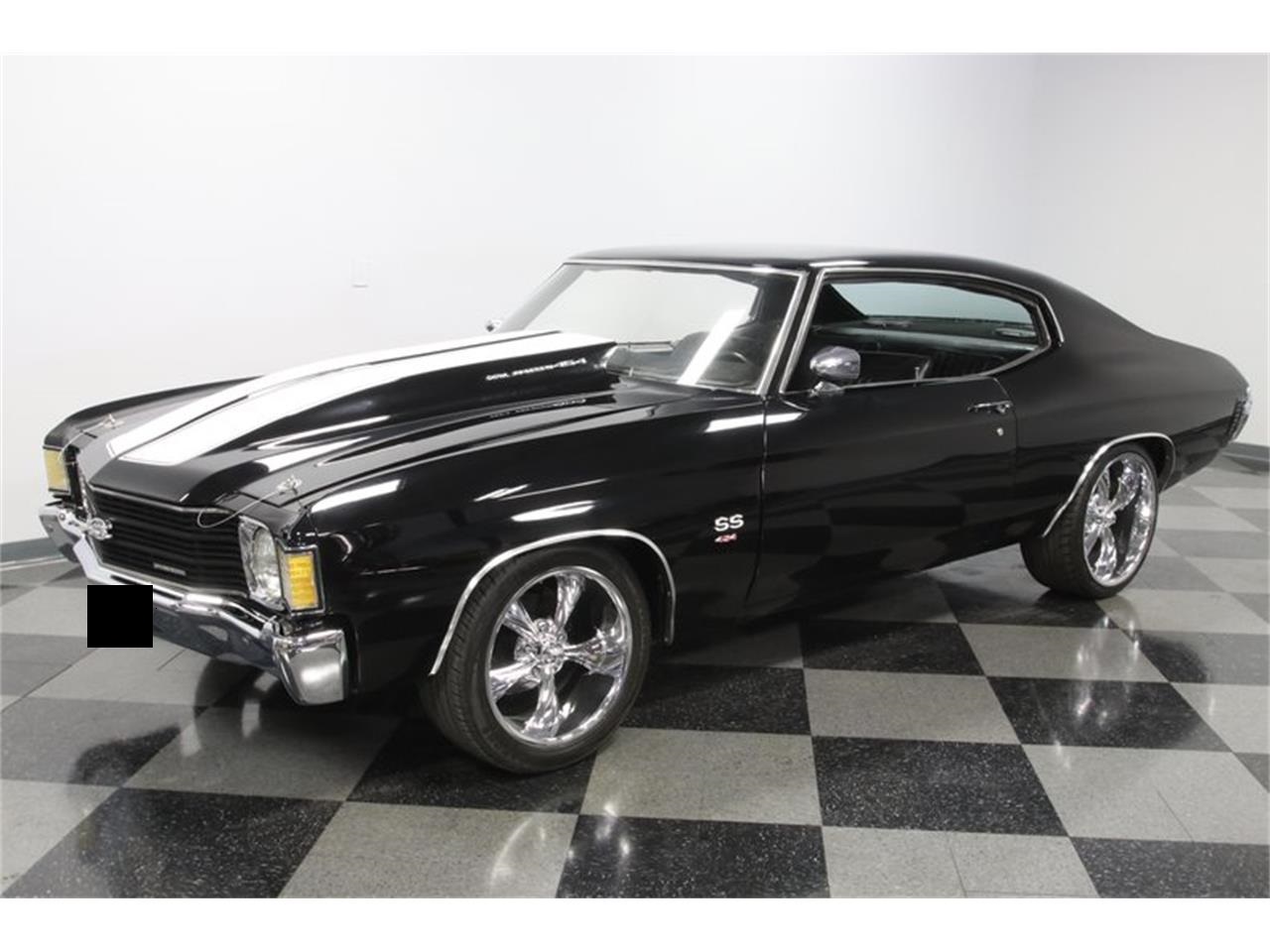 A mean black attitude, the growl of the big block V8, and the control of a four speed makes this 1972 Chevrolet Chevelle SS 454 Tribute pure intimidation on wheels. You know you love the look of this Chevelle. The slick black paint portrays the exact attitude you want on a muscle car like this. The deep shine highlights the straightness of the body. Plus, this really plays the part of a powerful and classic icon correctly. You see it in the features, like the fastback profile, hardtop roof, hood pins, and white painted racing stripes. And the extra large bulge in the cowl hood hints at upgraded power within.