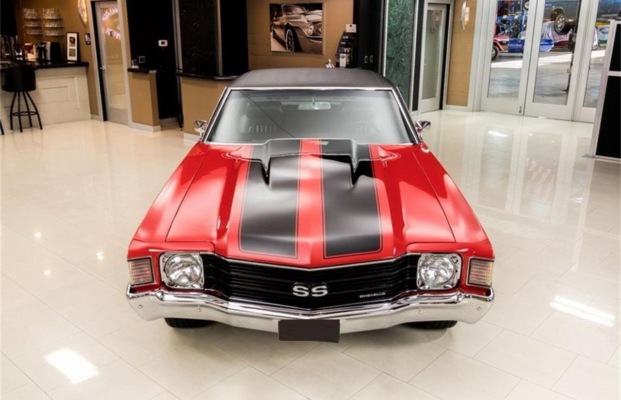 1972 Chevrolet Chevelle. This Chevelle has a beautifully straight body, glossy Red Paint finish, Painted Black Stripes, Black Vinyl Top, beautiful Black Interior, Chrome Cragar Wheels, along with Polished Components all around that s sure to turn heads wherever you go.
