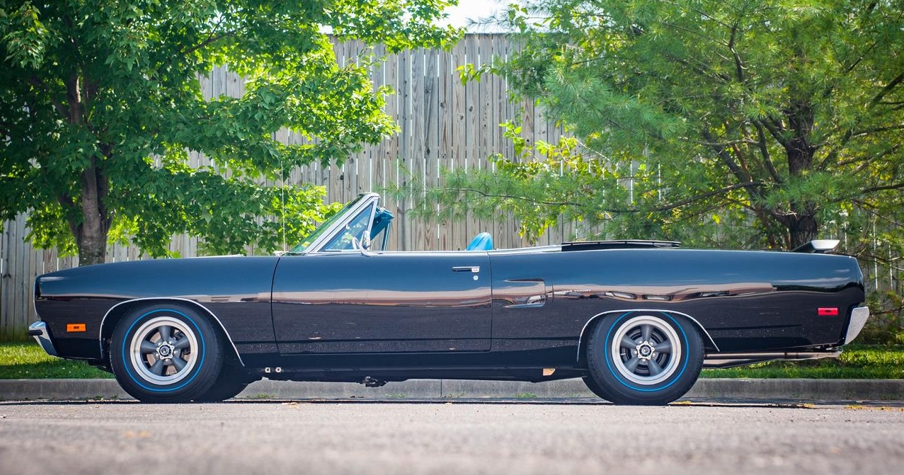 This gorgeous machine was built over a two year period and has had a lot of work done to her. It started out life as a 383 Big Block car that was painted B7 Blue with B5 Blue Interior. It has been totally taken apart and has had countless hours spent on making this body and paint show quality. The paint is a deep clear Black paint that is so amazing it looks like a mirror reflecting everything in sight. It is highlighted by the Blue Leather interior equipped with bucket seats and of course a pistol grip shifter. It is powered by a very mean yet streetable 472 HEMI featuring Eagle H beam Rods, Diamond Pistons, Kellogg Crank, and a set of Stage V Aluminum Heads.