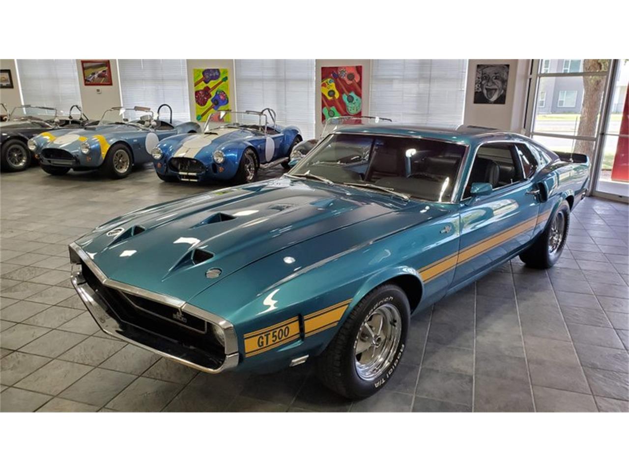 This 1969 Shelby GT500 is #584 documented in the 1997 Shelby American World Registry and is painted in Ford #3065-A Gulfstream Aqua with blackout hood treatment over Black Clarion Knit/Corinthian Vinyl Hi-back bucket seats.