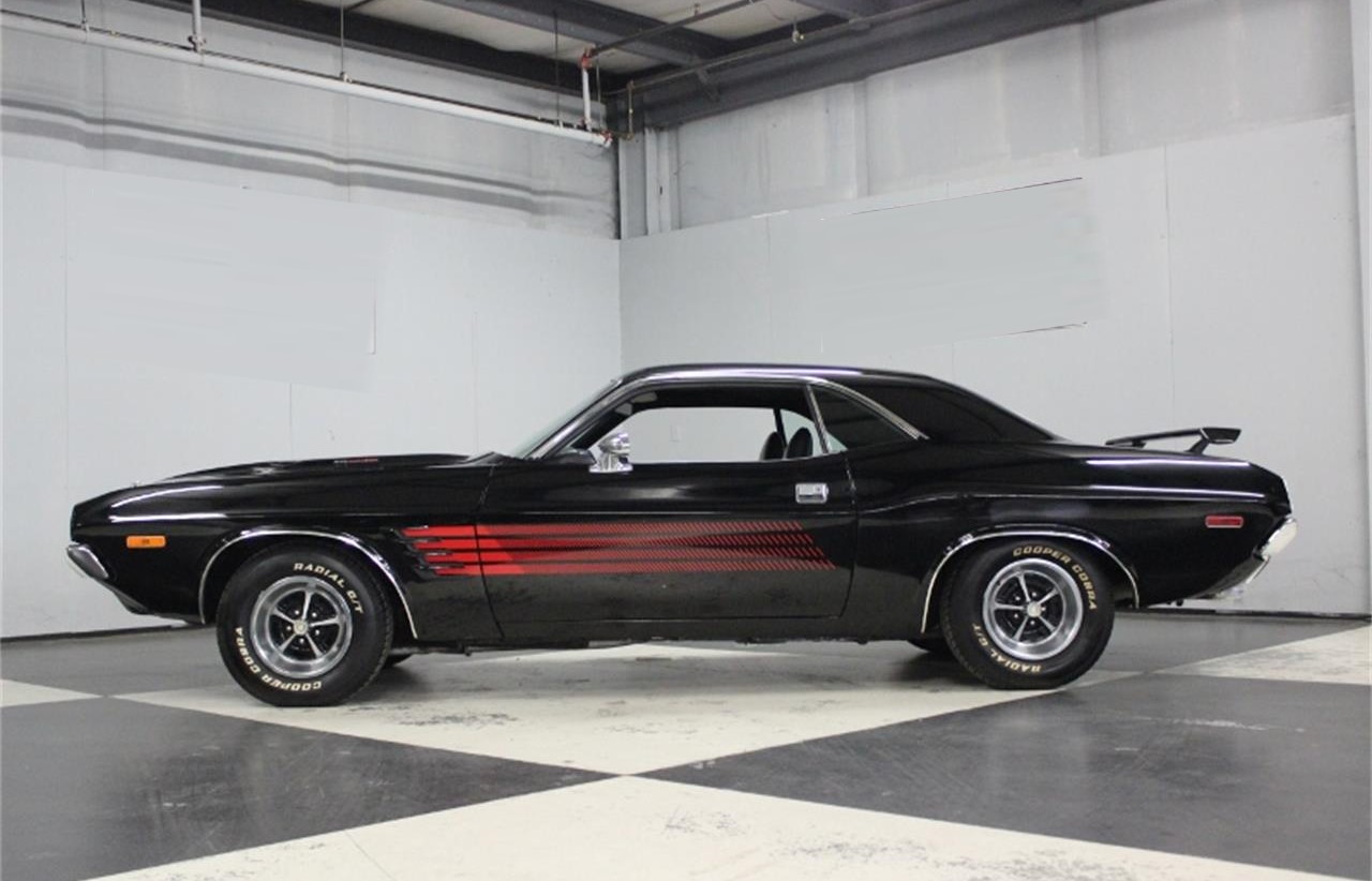 1973 Dodge Challenger Painted Black with Red stripes down the side this car is slick and straight.The front rear bumpers are like new, dual hood scoop, dual outside mirrors, window trim like new The drip rail moldings are like new.The door handles are good. Wheel well moldings like new, side marker lights like new.