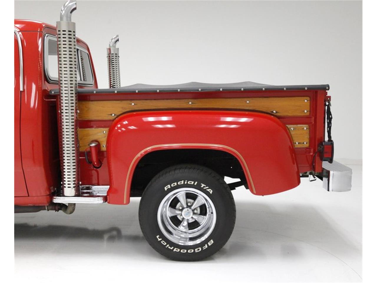 Exterior: Bathed in the factory original Medium Canyon Red paint, no rust, no dents. Gold lettering on the doors, gold pin striping throughout, and solid wood panels tucked into everywhere but the hood, doors, and on the fenders, and are looking very original. Adding to the mystique are dual exhaust stacks which work their way through the step sides and tower to the sky next to the cab. These are nice and shiny and are wrapped in a protective perforated metal chromed covering. Bumpers and trim are nicely chromed and 15-inch Cragar polished chromed wheels are on all 4 corners. Interior: All nicely preserved and very clean, black vinyl door panels with some wood applique, and a cloth black bench in good condition. Dash is all original and very clean as is steering wheel, black carpet with stamped RAM in red rubber molded mats, and red sprayed metal headliner are seen. Drivetrain: A flip of the hood and we shake hands with an original mill, that is clean and in its 360ci V8 format. A Thermoquad 4-barrel carbuertor feeds this engine and an A727 Torqueflite 3-speed automatic transmission is on back. In the way back is a Dana 9-1/4-inch rear with 3.55 gears.