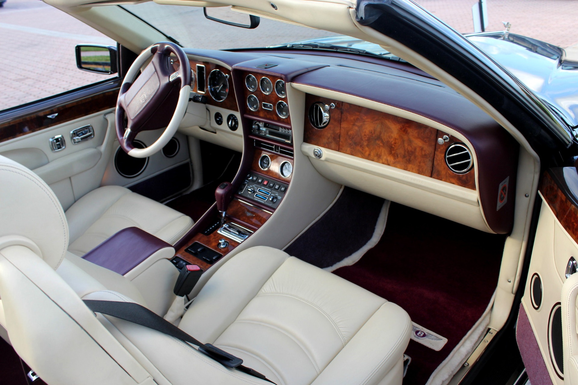 1998 BENTLEY AZURE CONVERTIBLE. Largely influenced by the limited production Mulliner RT series long wheelbase sedans of the era, the appearance package includes: LeMans style front wing vents, stainless headlamp surrounds, 18 chrome alloy wheels, winged B motifs to the headrests and waist rails, chrome instrument bezels, standing winged B mascot with accompanying center molding to the hood, drilled alloy pedals and the very rarely seen optional jeweled fuel filler cap.
