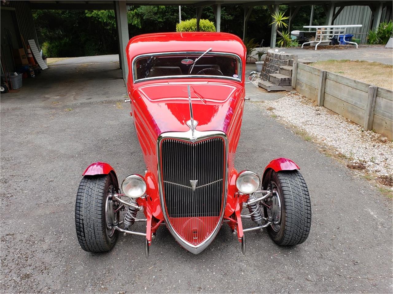 This original all-steel 1934 Ford 5-Window Coupe is finished in red over a tan leather interior and is powered by a 540ci Chevrolet V8 paired with a 3-speed automatic transmission