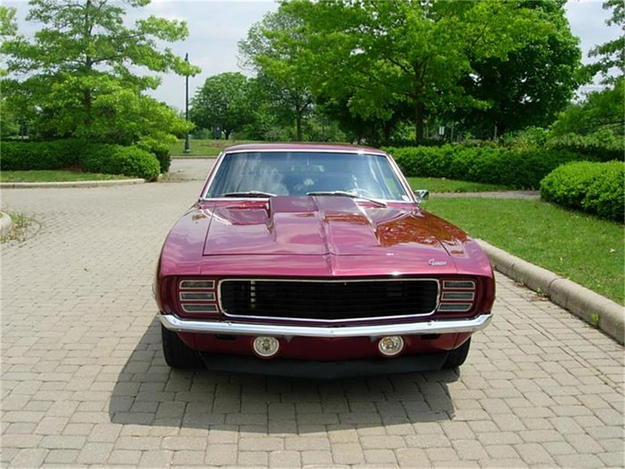 69 Chevrolet Camaro Maroon exterior with a 383 Chevy Stroker engine, Aluminum intake, Aluminum radiator, dual electric fans, ceramic coated headers, chambered exhaust, Ring Bros. billet hinges, fender supports, front and rear sway bars. Driving is made easy with a 700R automatic transmission with 10 bolt rear end with 3:73 gears and posi-traction. Power four wheel disc brakes front and back makes stopping easy with coil over adjustable shocks. Interior features custom Black and White Houndstooth seats with custom door panels, console with Auto Meter gauges, Billett window cranks and steering wheel. Billet Specialties 17” wheels ride on Nitto tires.