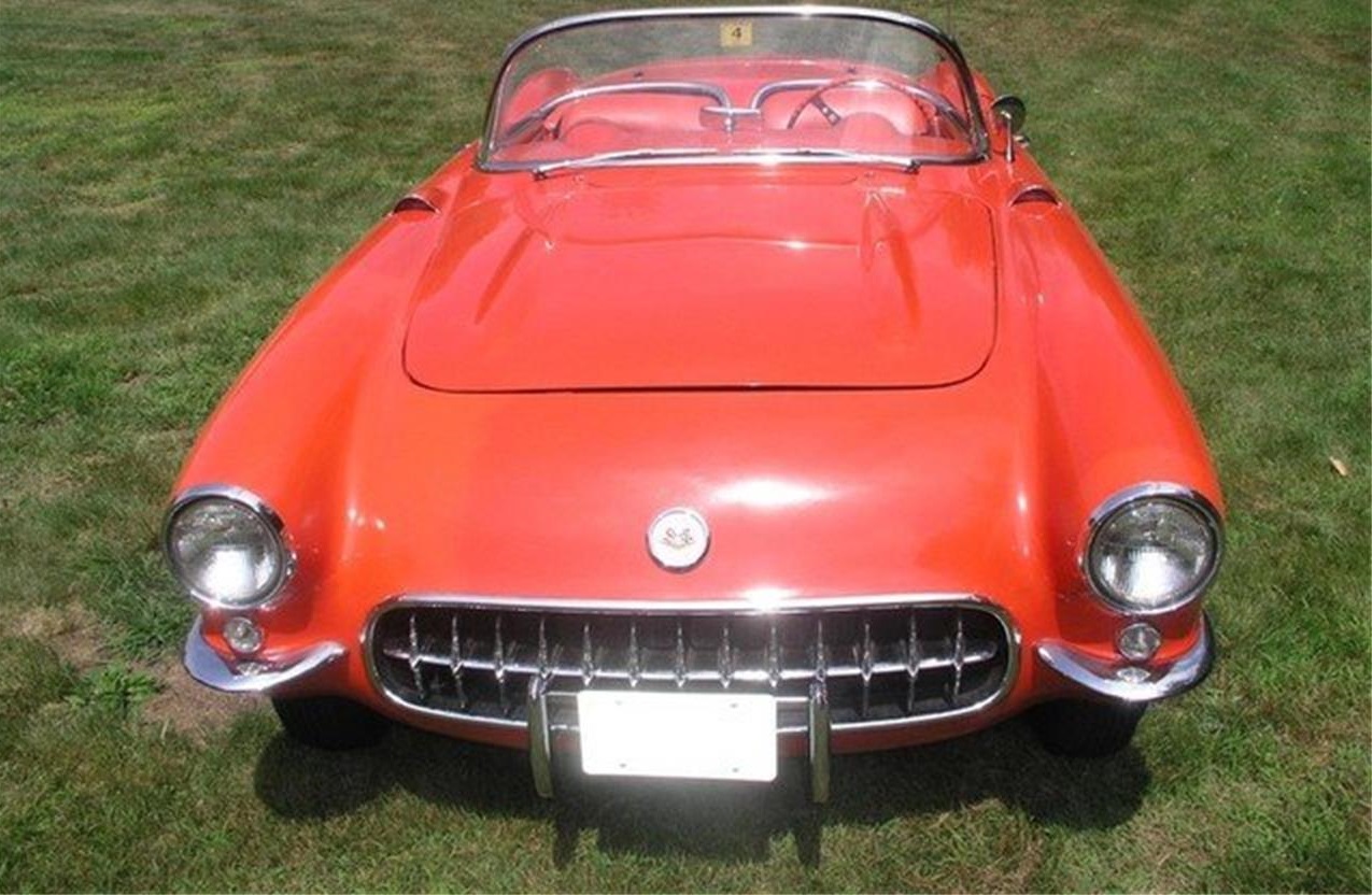 This a beautiful 1956 Chevrolet Corvette finished in Venetian Red with a complementary Red interior. This car has the original 265ci motor with two four barrel carburetors and a period correct 2 speed automatic transmission. The car has traveled 54,300 original miles. The paint is original and is very good condition. The interior is 100% original and also in excellent condition. The steering wheel, the gauges, seats, and door panels look fantastic as do the badges etc. Everything works as it is supposed to and the car comes with two tops.