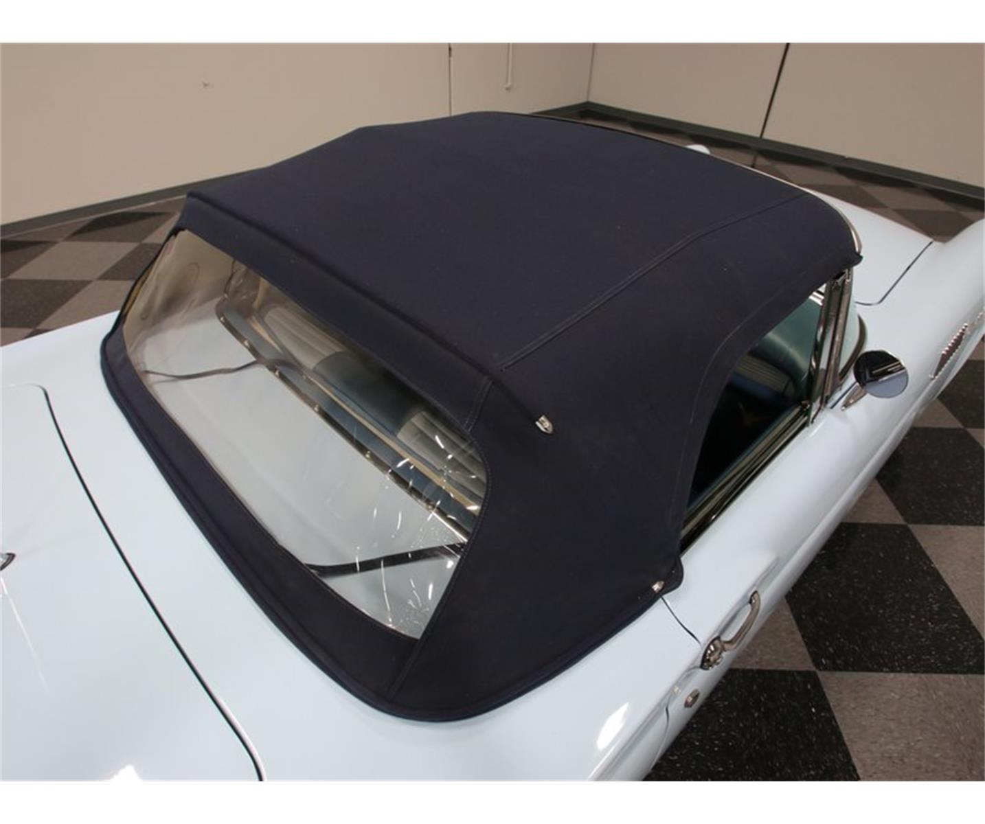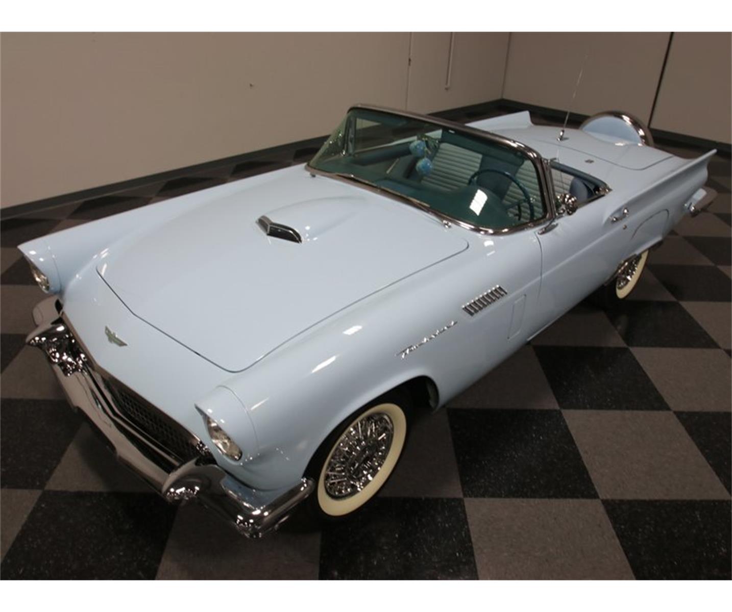 This is a real-deal, documented E-code 1957 Thunderbird. That means dual quads atop the 312 cubic inch V8. It's all quite correct, from the neatly clustered instruments to the floor shifter for the Ford-O-Matic 3-speed automatic transmission. There are no "updates" or modifications to any of the interior systems, and even the original AM radio remains in its engine-turned panel in the dash. The car comes with two tops, a color-matched light blue hardtop with porthole and a beautifully fitted navy blue canvas convertible top with a crystal clear rear window. E-code engine under the hood, complete with dual quads, 270 horsepower. Both power steering and power brakes make this E-Bird easy to handle and for style, nothing compares to a set of chrome wire wheels wearing 205/75/14 Coker Classic wide whitewall radials.